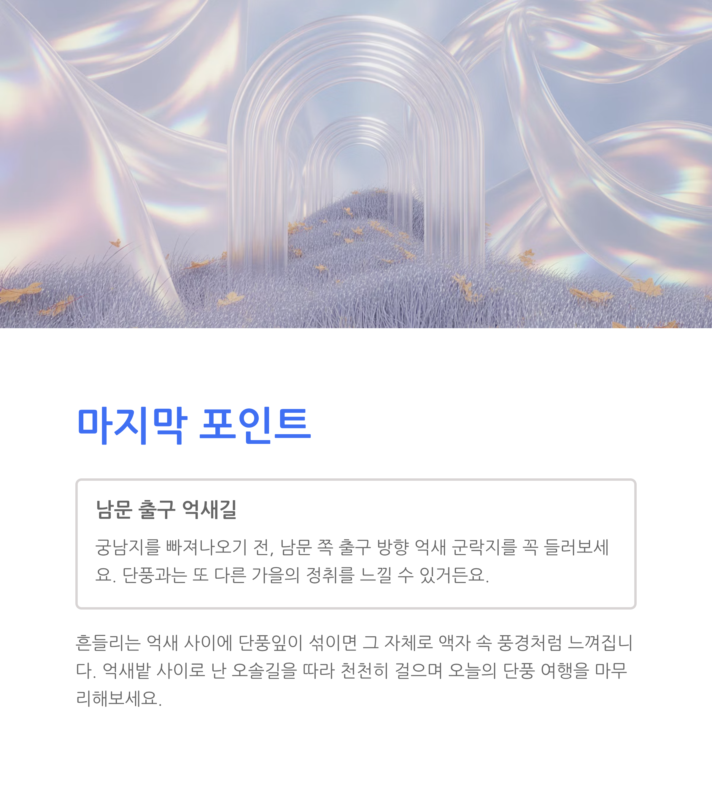 | 남문 억새길 | 단풍+억새 조화 | 해질 무렵 | 쓸쓸하고 아름다움 |