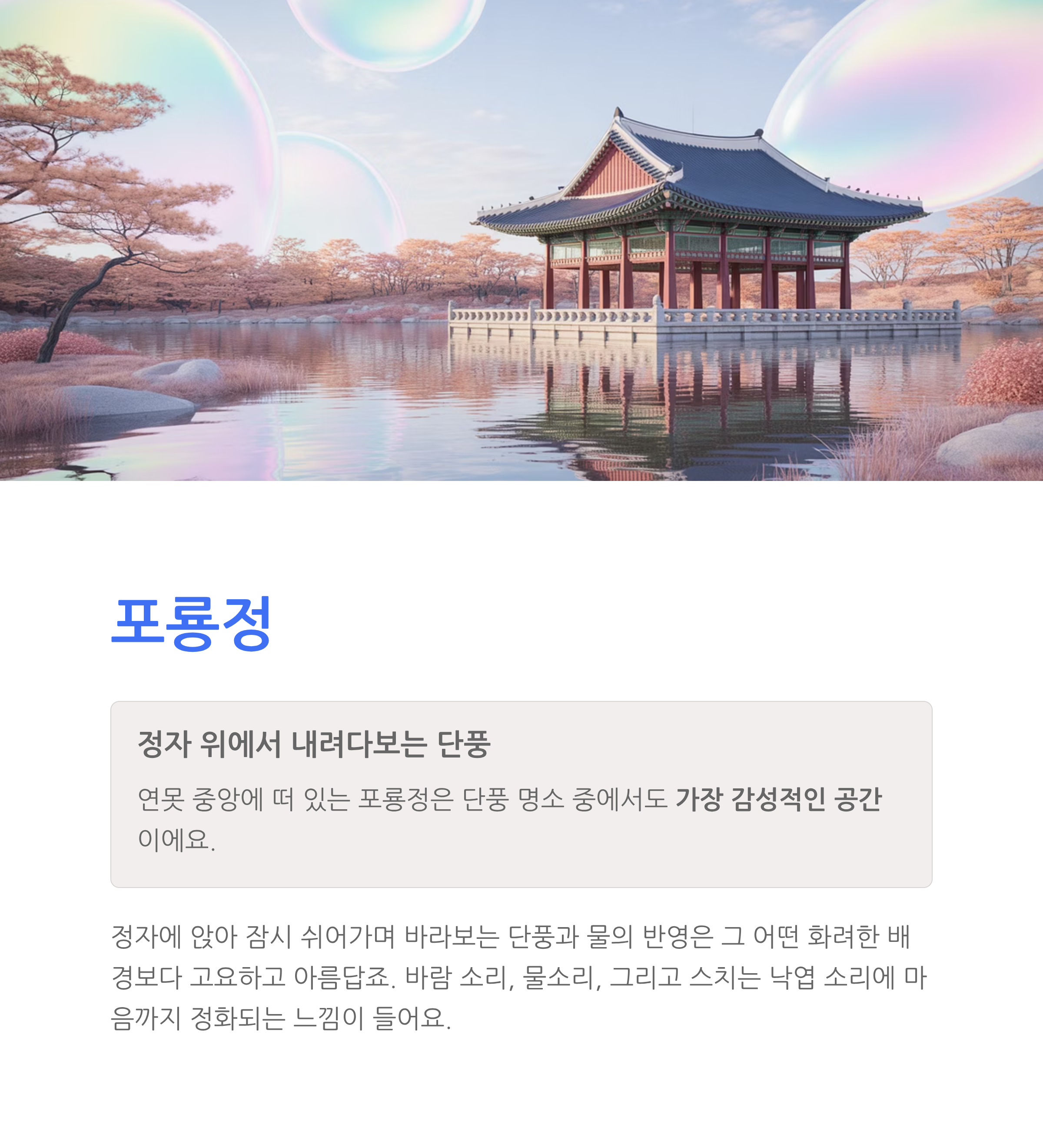 | 포룡정 | 정자 뷰 | 오후 2시 | 고요하고 감성적 |