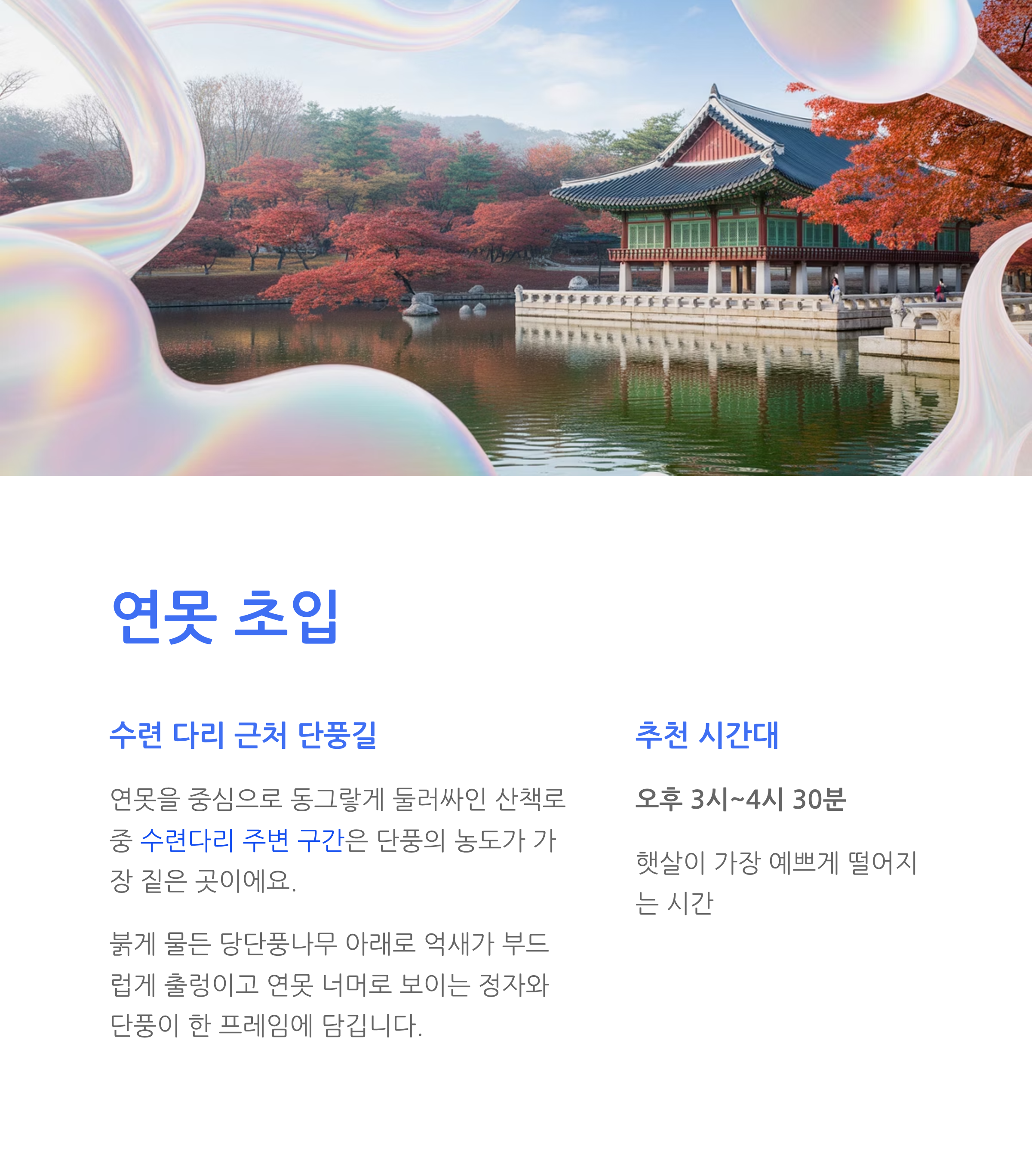 | 수련다리 | 단풍 반영 스팟 | 오후 3시 | 깊고 화려함 |