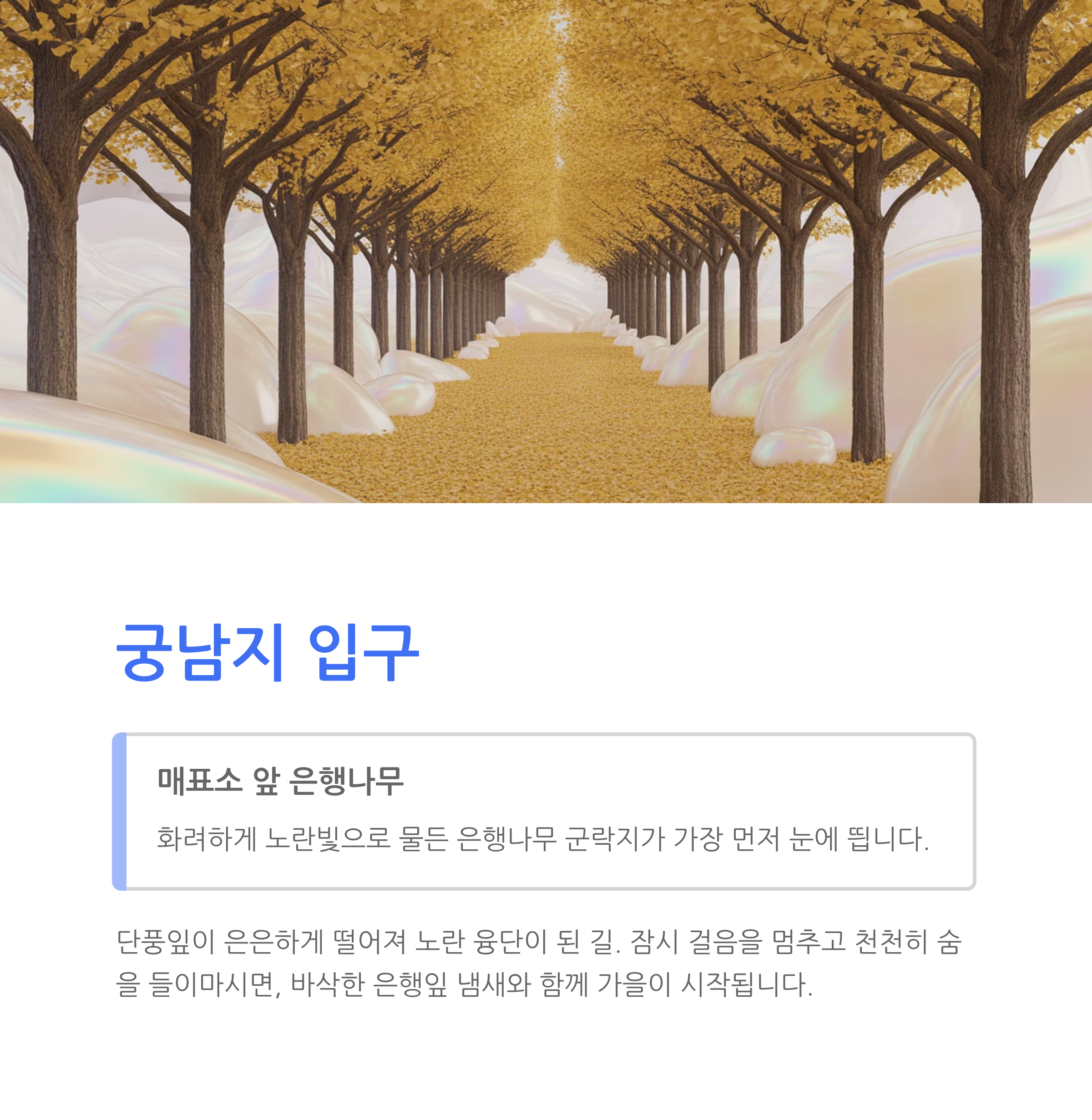 | 입구~은행나무길 | 노란 단풍길 | 오전 10시 | 밝고 포근함 |