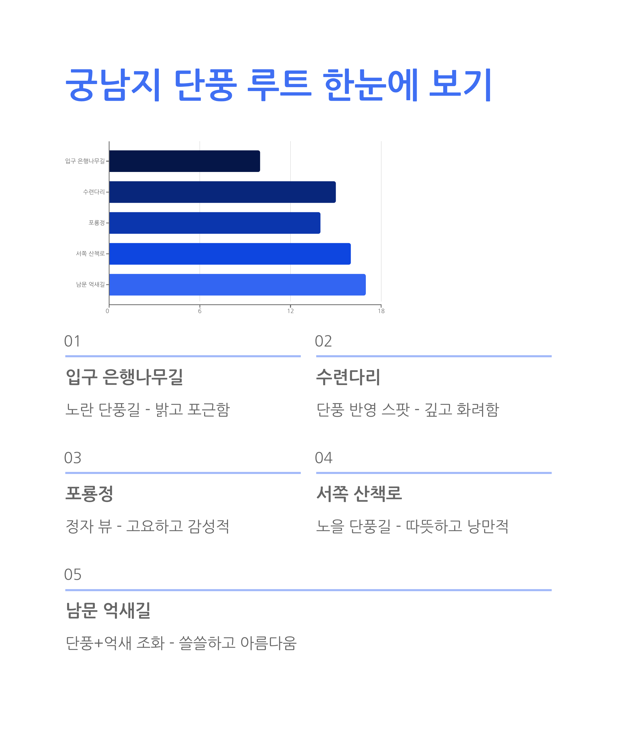 | 서쪽 산책로 | 노을 단풍길 | 오후 4시~5시 | 따뜻하고 낭만적 |