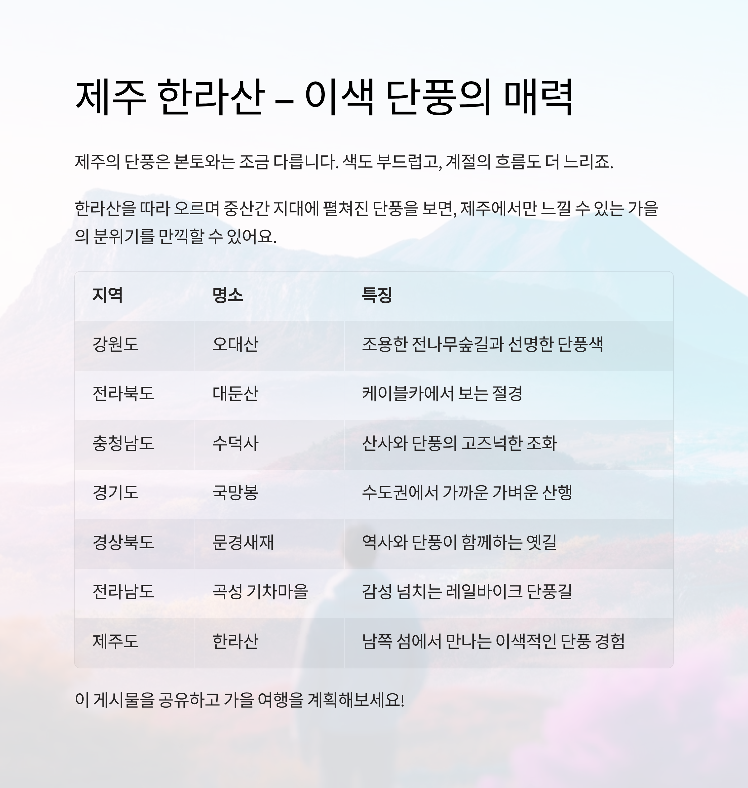 | 제주도 | 한라산 | 남쪽 섬에서 만나는 이색적인 단풍 경험 |