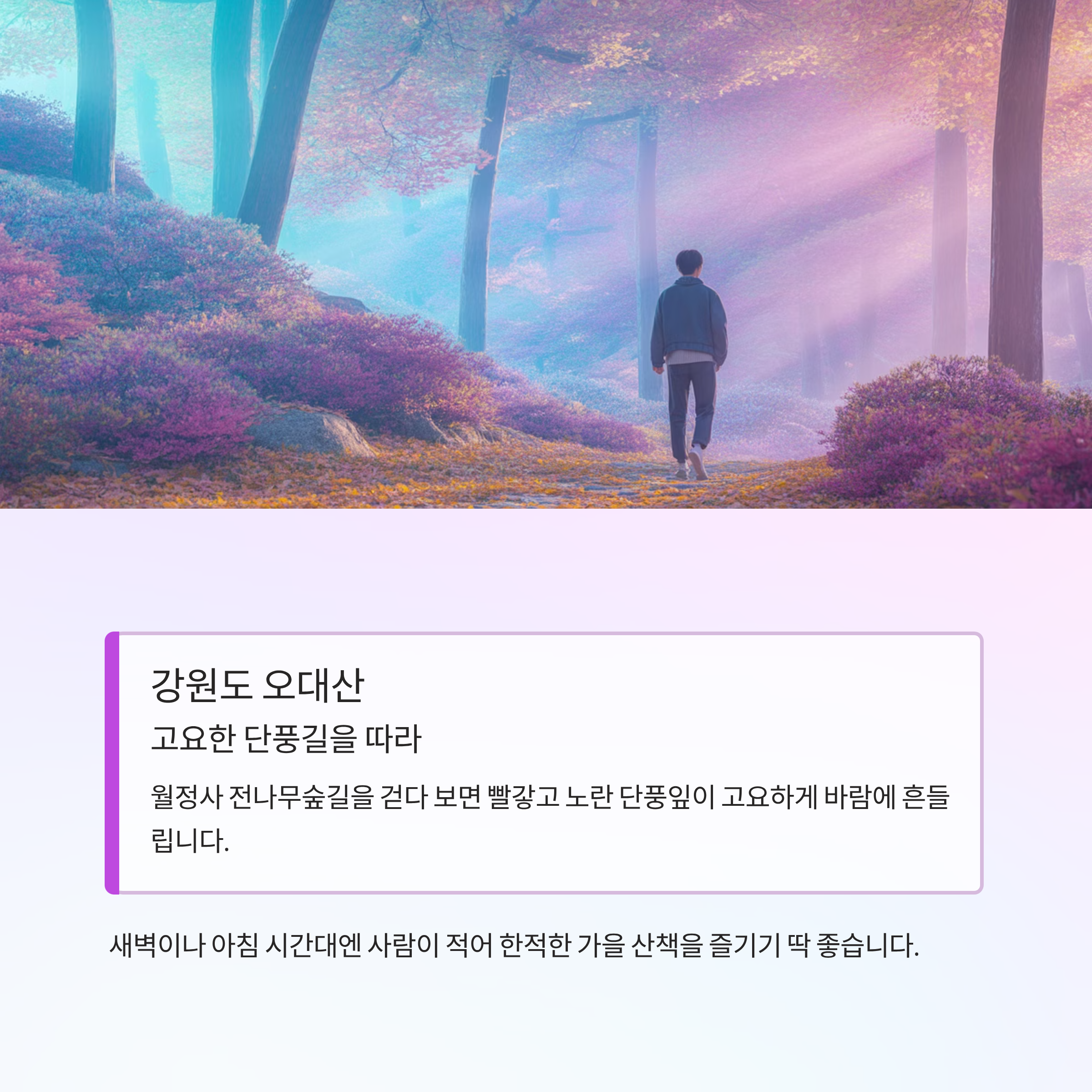 오대산은 설악산만큼 유명하진 않지만 단풍의 아름다움만큼은 절대 뒤지지 않아요. 월정사 전나무숲길을 걷다 보면 빨갛고 노란 단풍잎이 고요하게 바람에 흔들리는 모습을 볼 수 있습니다.