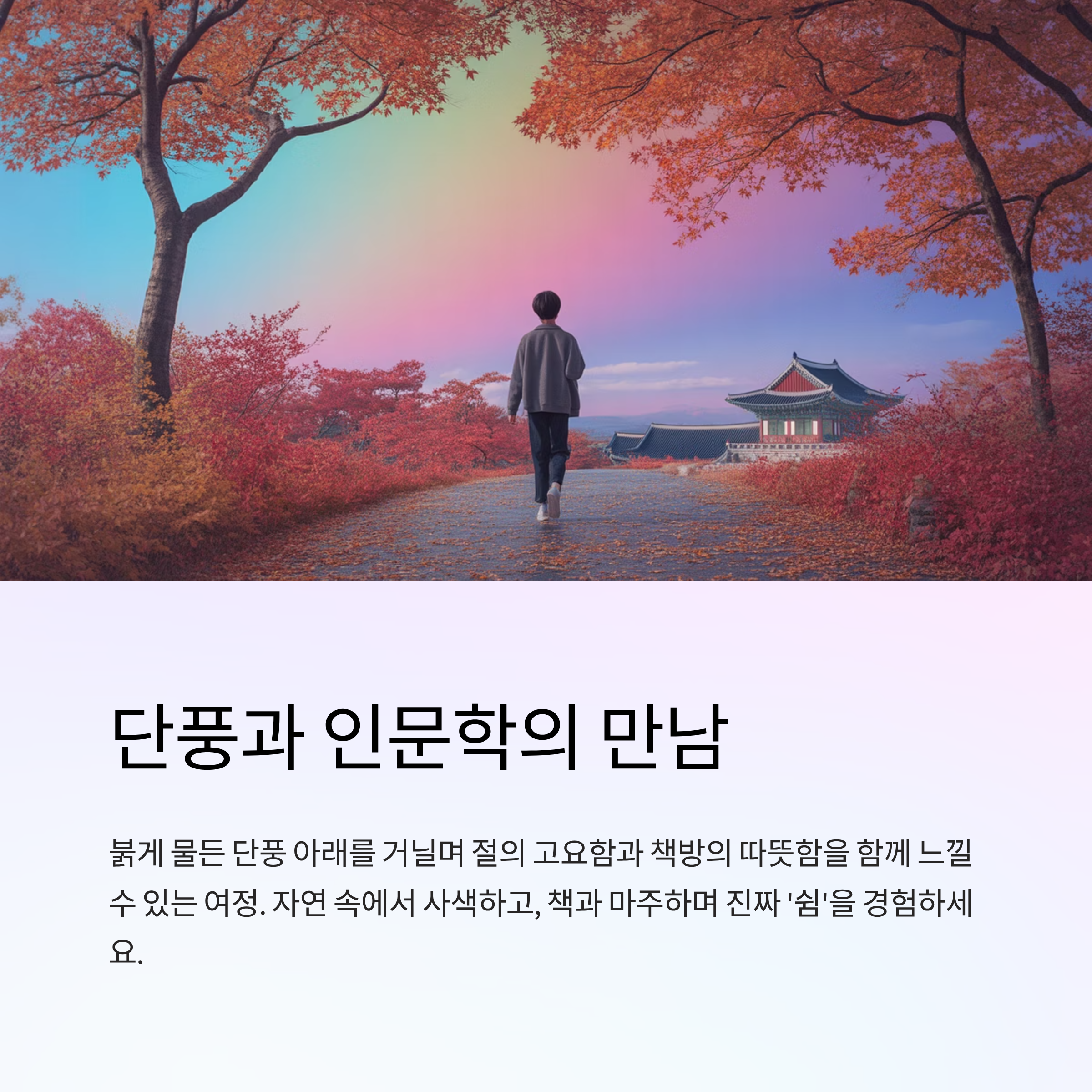 가을이면 어디론가 떠나고 싶은 마음이 들지 않으신가요? 붉게 물든 단풍 아래를 거닐며 절의 고요함과 책방의 따뜻함을 함께 느낄 수 있는 인문학 여행 코스를 소개합니다. 이 코스는 자연 속에서 사색하고, 잠시 일상에서 벗어나 책과 마주하며 진짜 ‘쉼’을 경험할 수 있는 여정을 담고 있습니다.