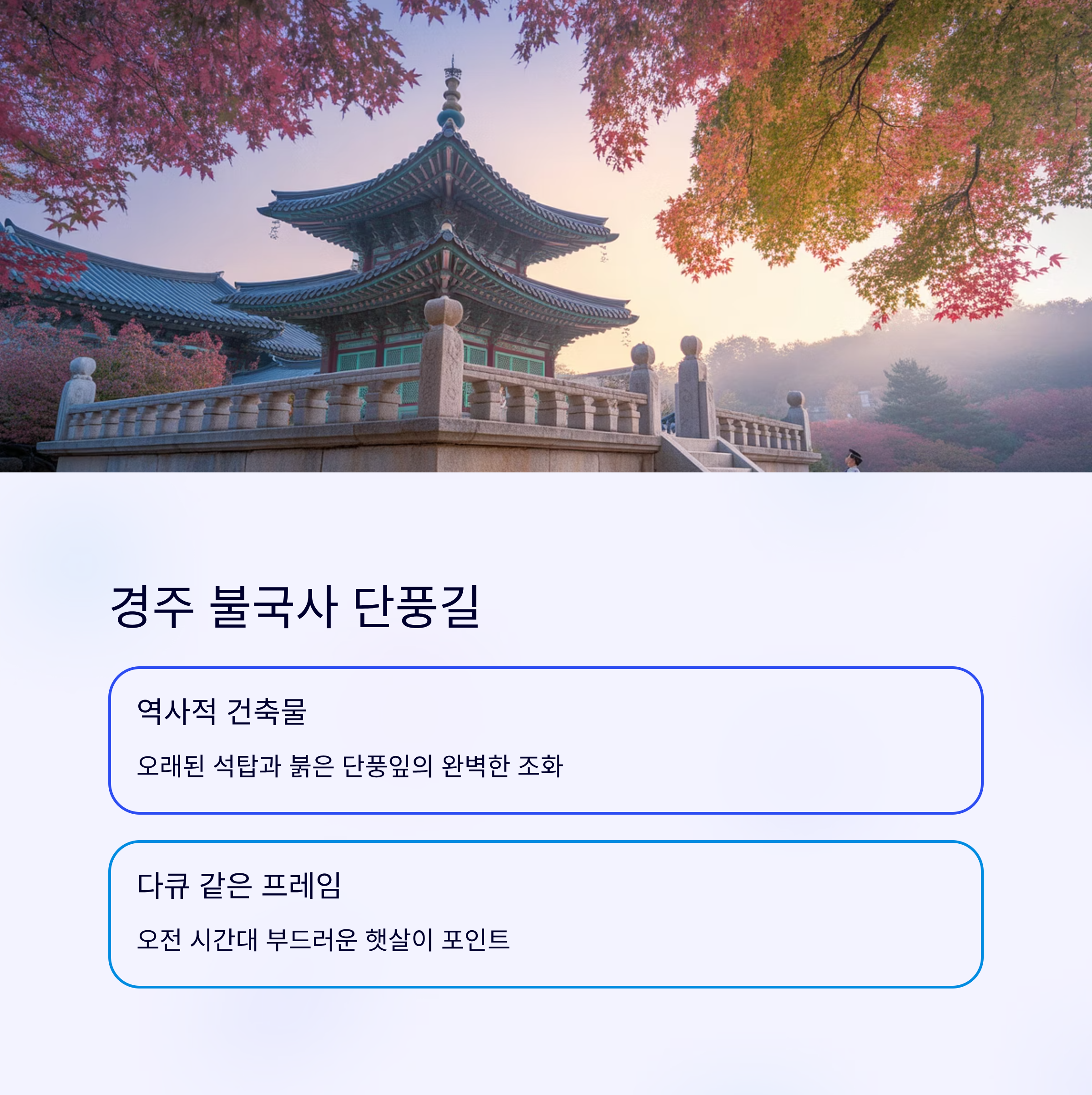 오래된 석탑과 붉은 단풍잎이 프레임에 담기면, 그 자체로 한 편의 다큐처럼 보여요.