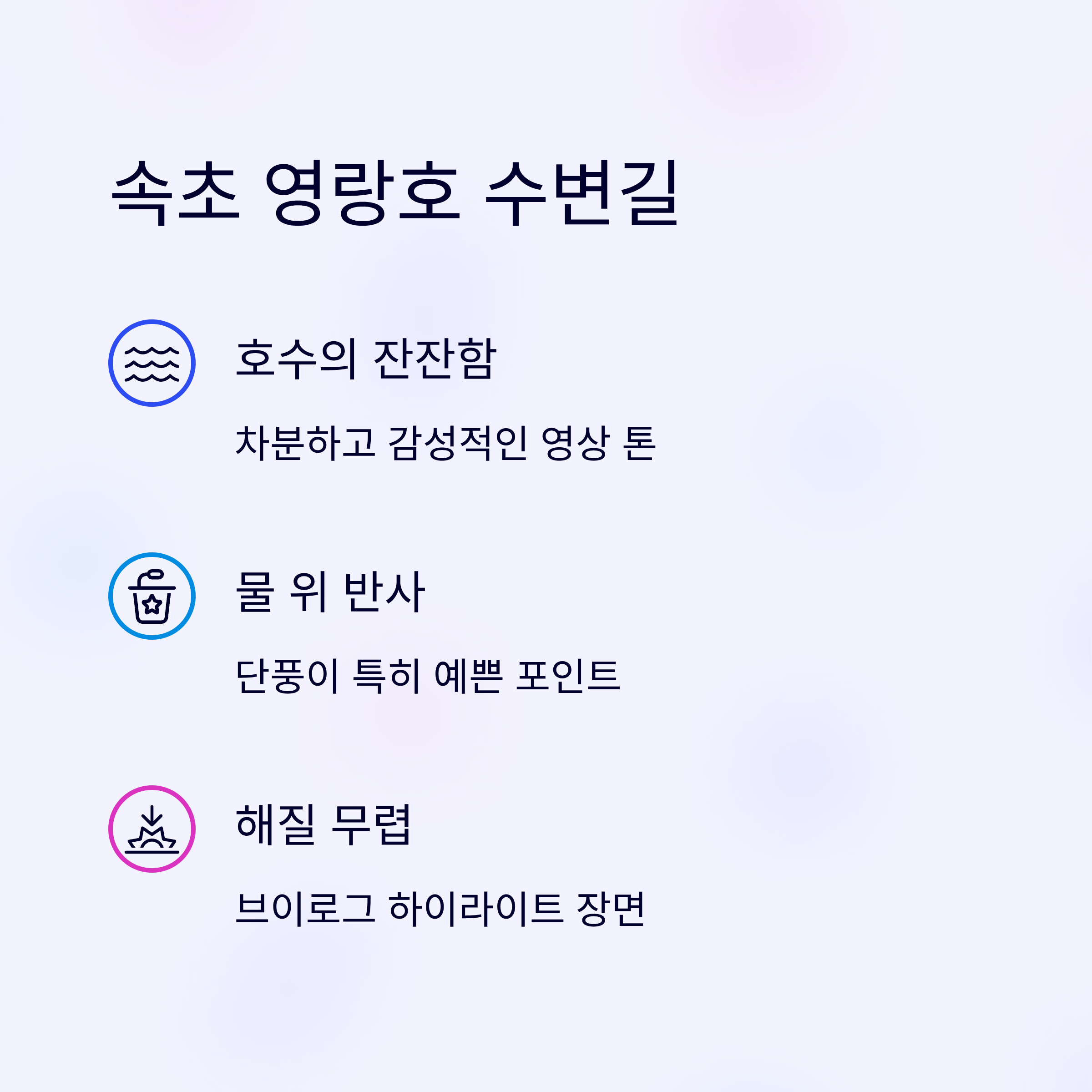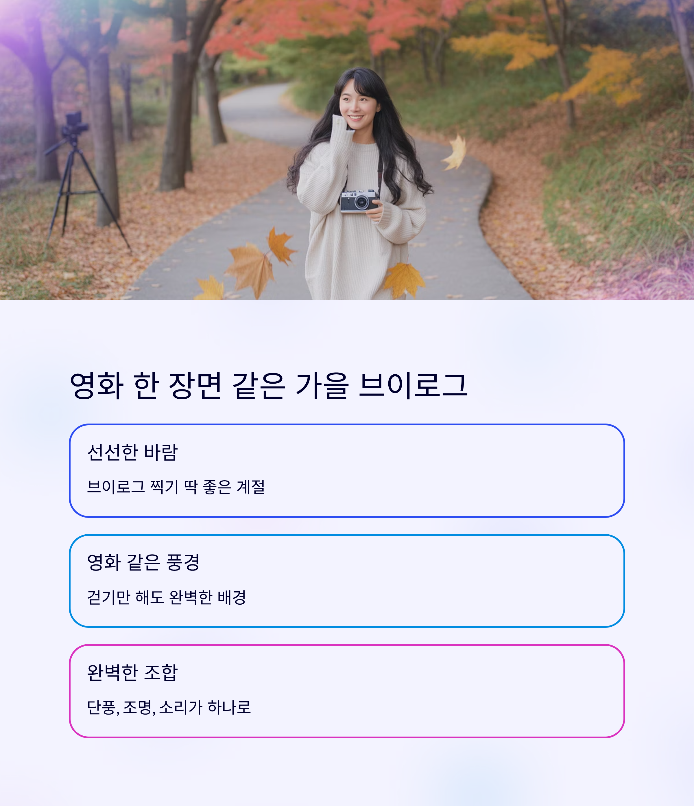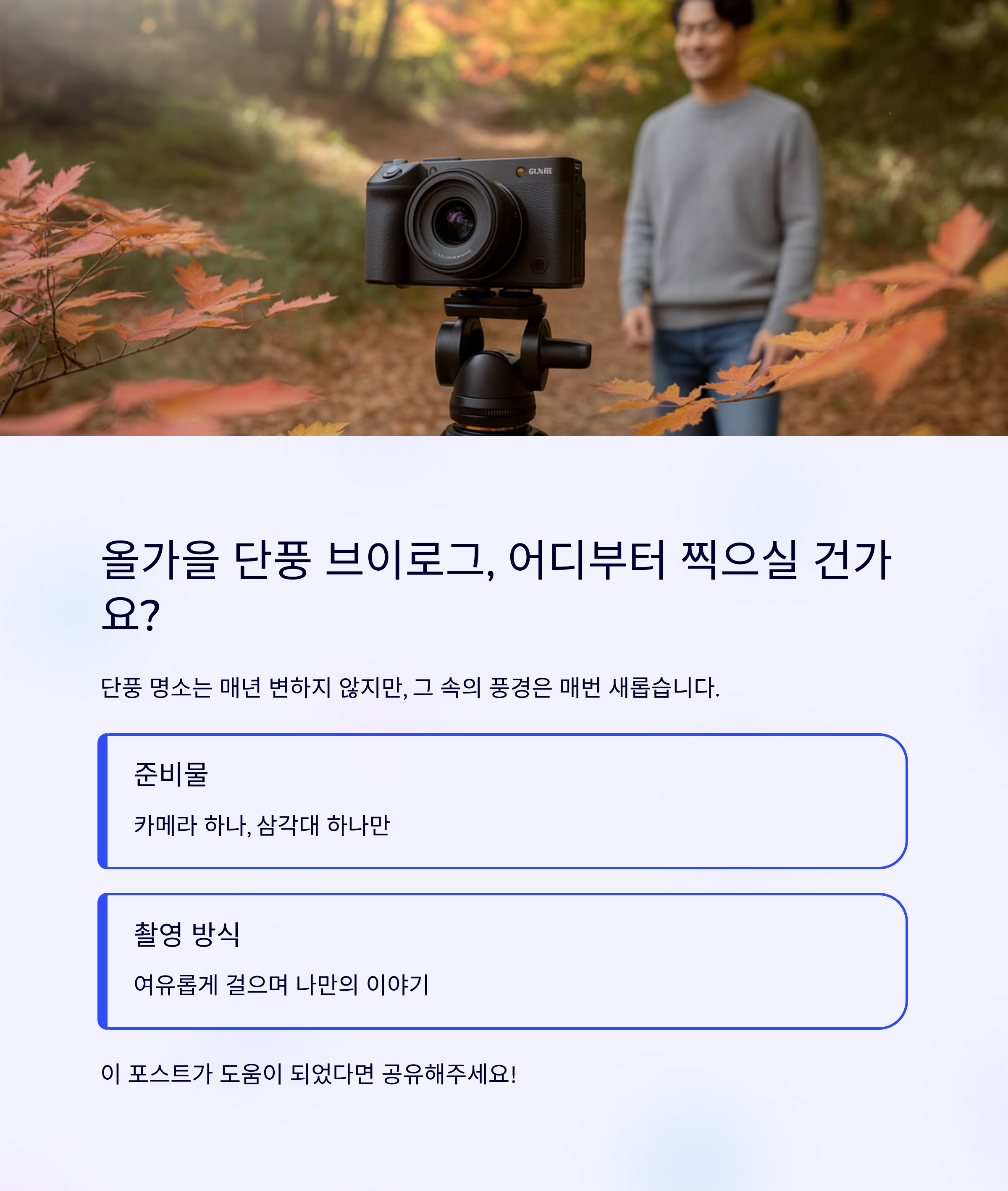 선선한 바람이 불어오는 가을, 브이로그 찍기 딱 좋은 계절이죠. 이번 포스팅에서는 걷기만 해도 영화 한 장면처럼 나올 수 있는 국내 단풍 명소를 소개할게요. 단풍과 조명, 소리, 걷는 길 하나하나가 모두 영상의 배경이 되는 장소들이니, 올가을 브이로그를 준비 중이라면 꼭 참고해보세요.