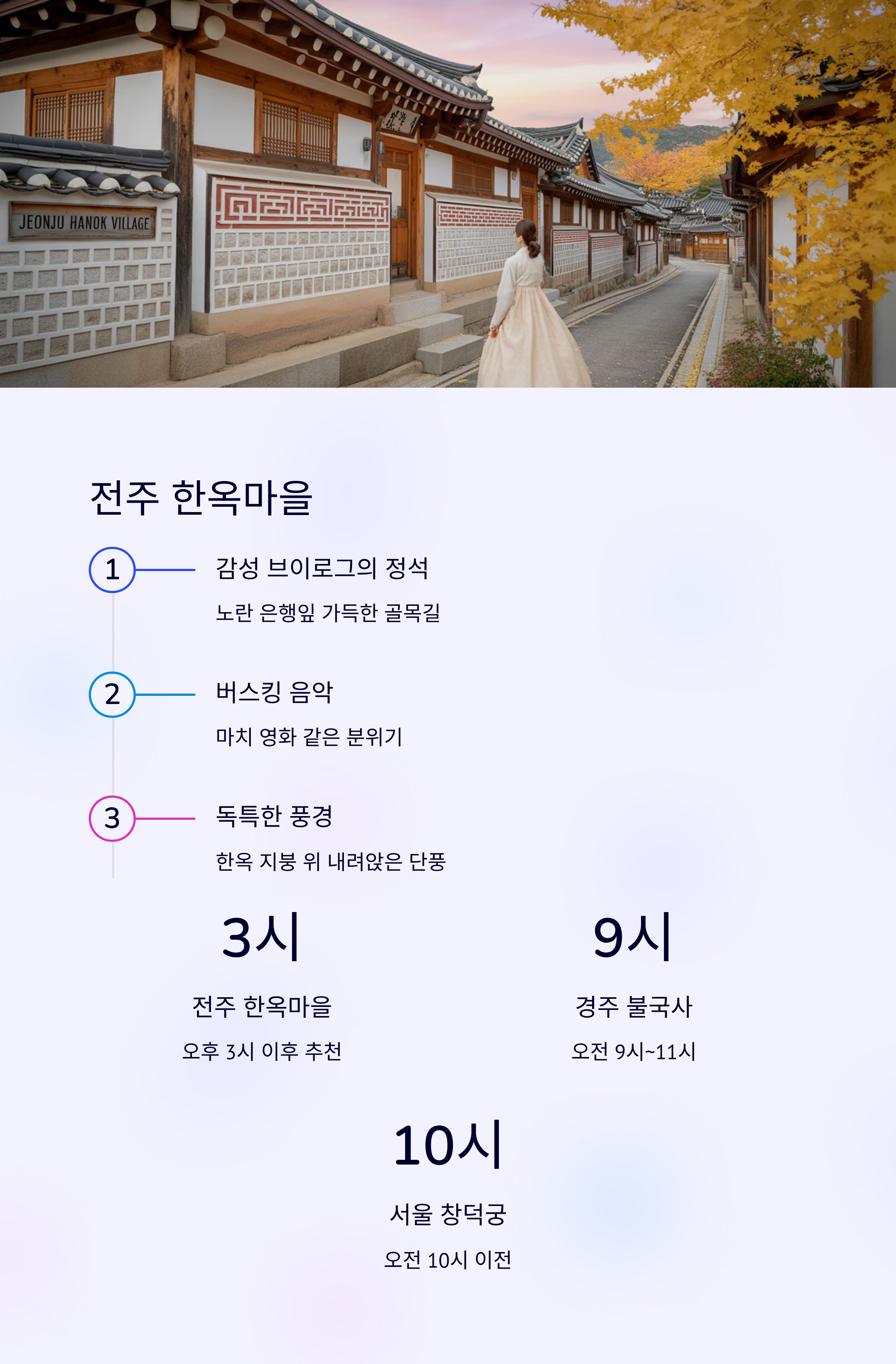 | 전주 | 한옥마을 골목, 전동성당 | 오후 3시 이후 |