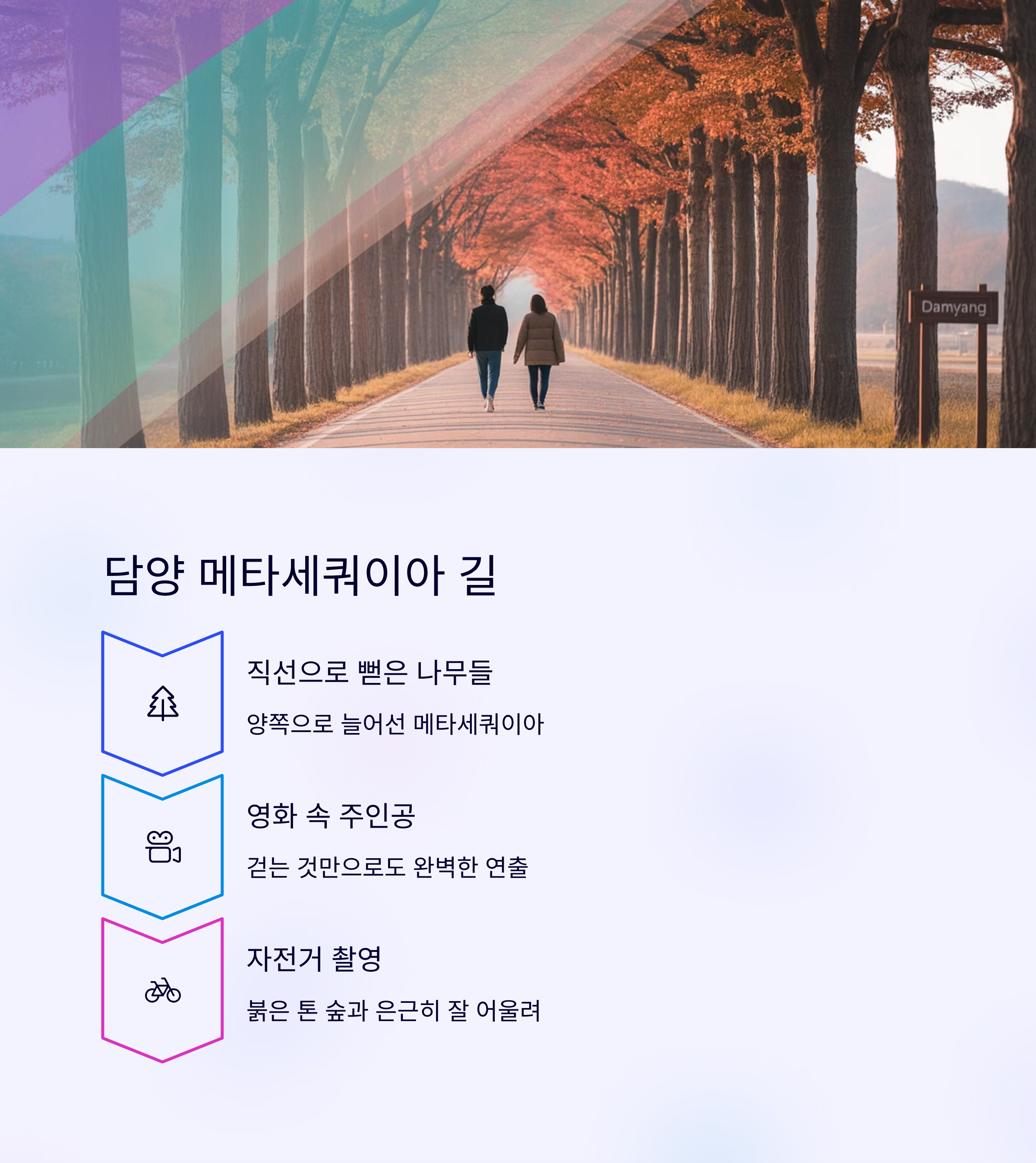 직선으로 뻗은 메타세쿼이아 나무들이 양쪽으로 늘어서 있어 걷는 것만으로도 영화 속 주인공이 된 듯한 느낌을 줘요.