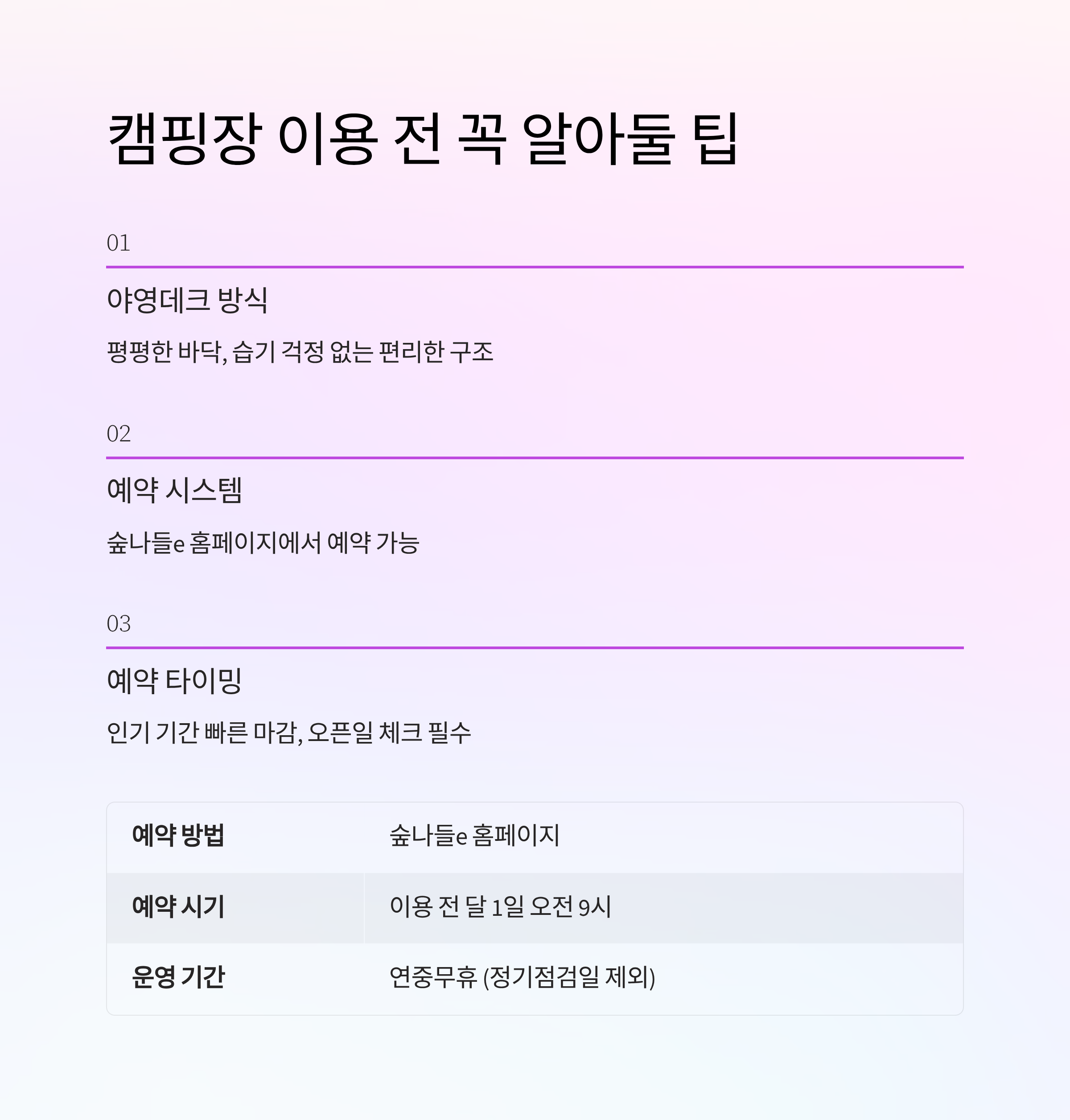 예약은 '숲나들e' 홈페이지에서 가능하며, 인기 기간에는 빠르게 마감되니 예약 오픈일을 잘 체크해두셔야 해요.