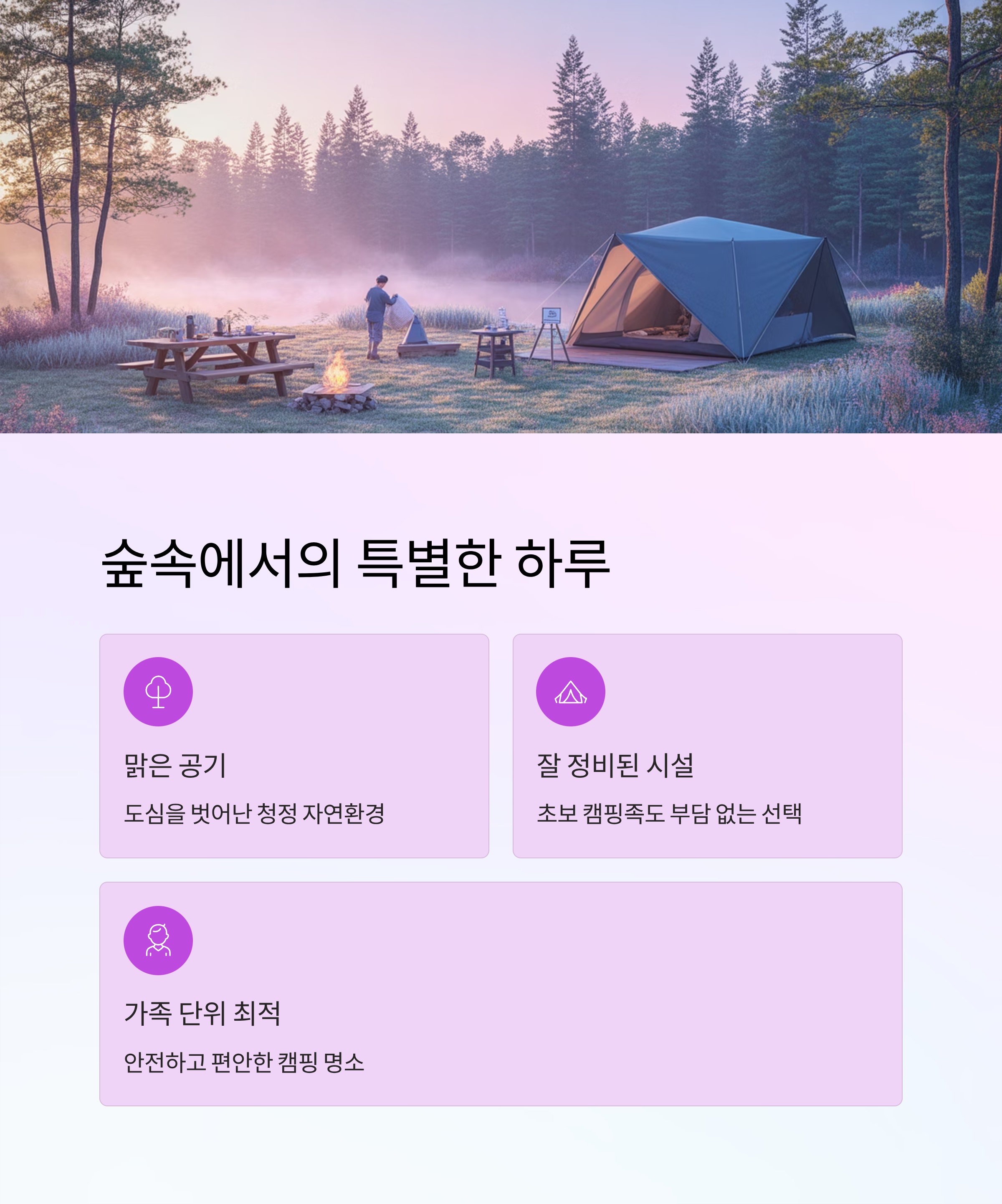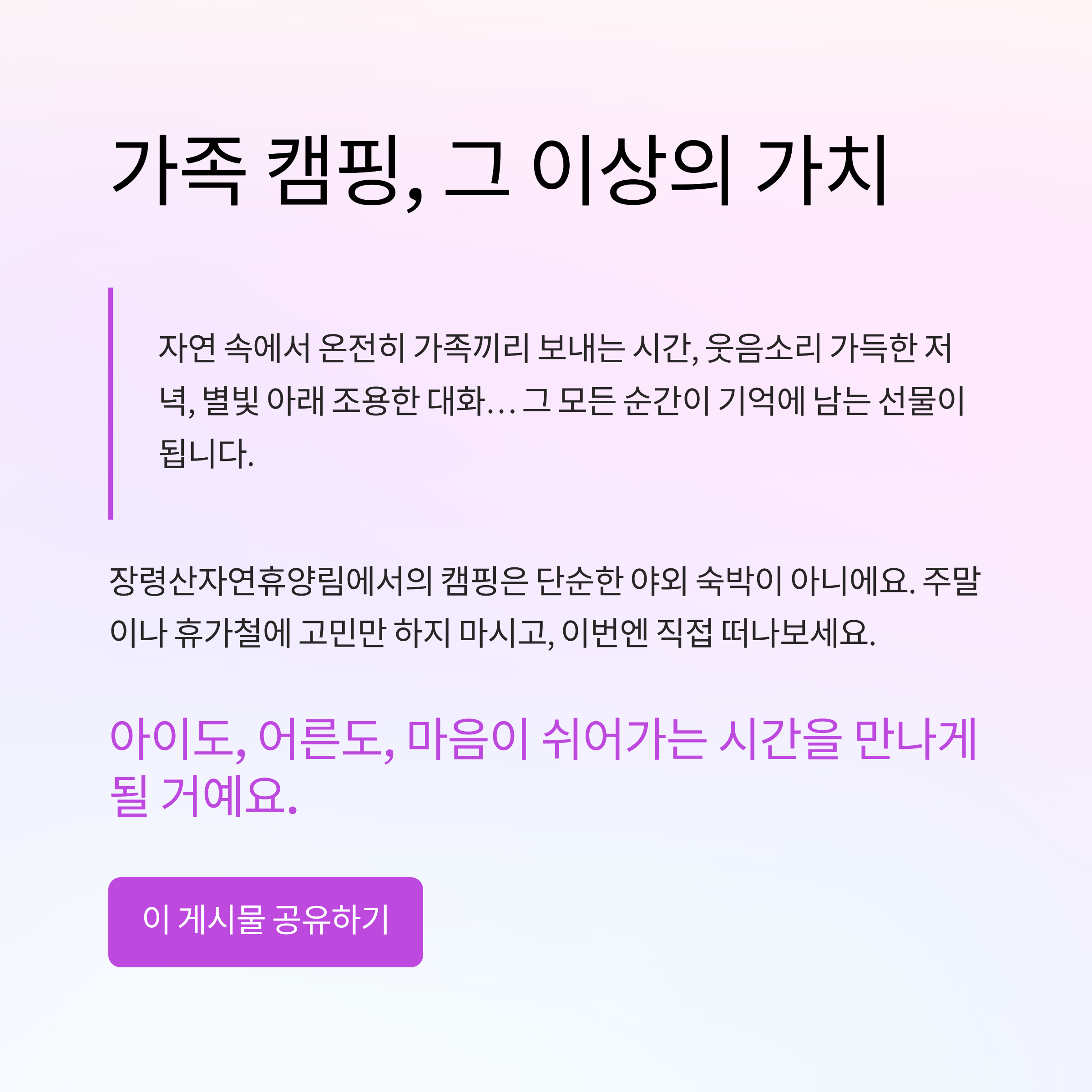 자연 속에서 온전히 가족끼리 보내는 시간, 웃음소리 가득한 저녁, 별빛 아래 조용한 대화…