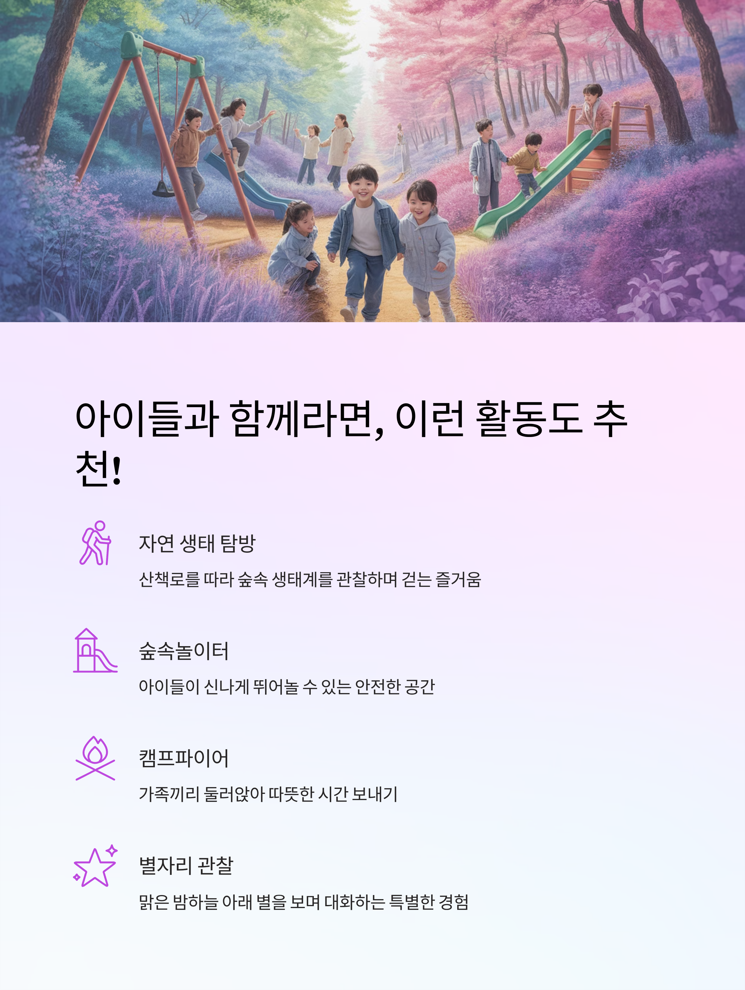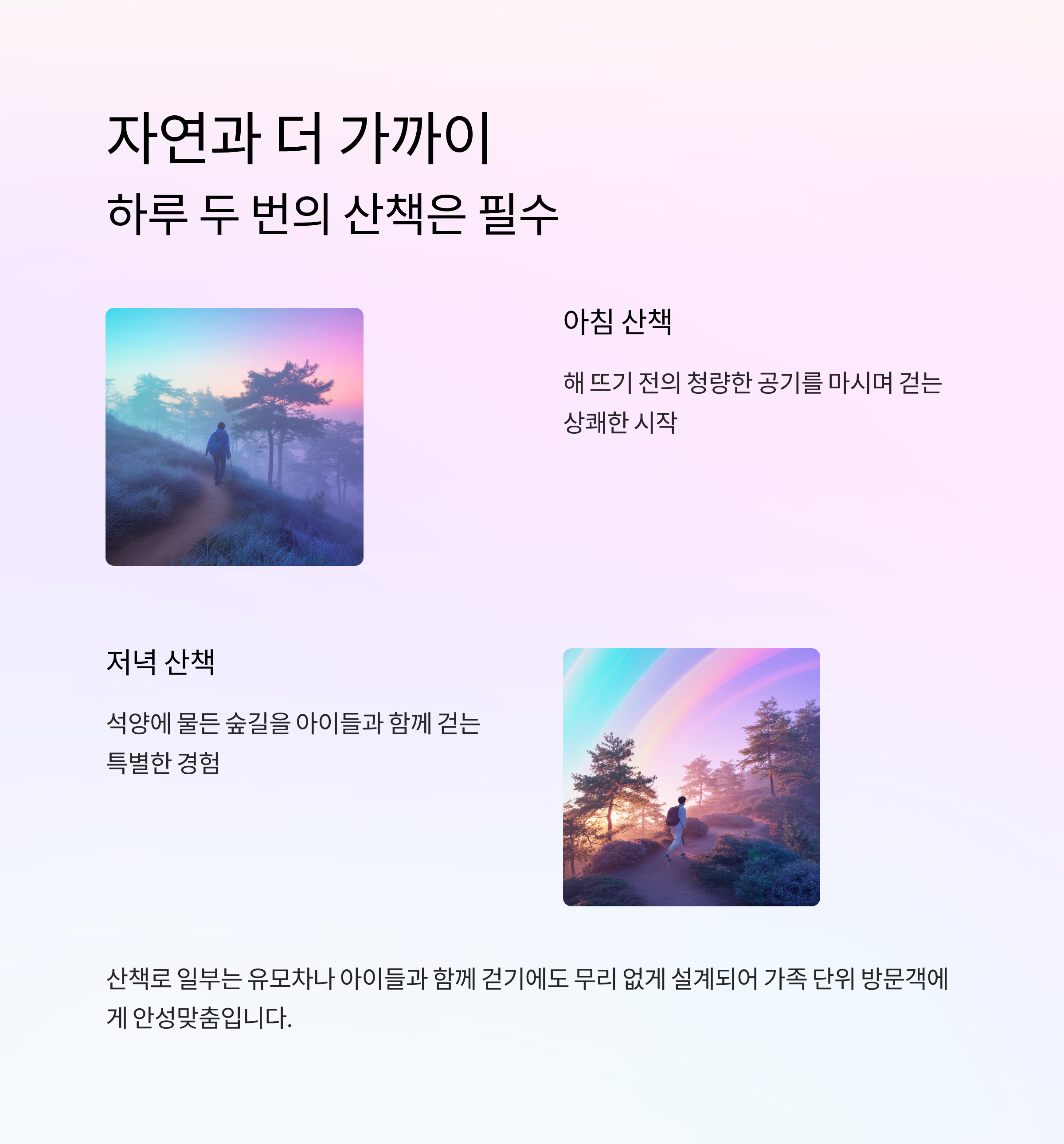 해 뜨기 전의 청량한 공기, 석양에 물든 숲길을 아이들과 함께 걷는 그 시간은 일상에서는 절대 누릴 수 없는 경험이에요.