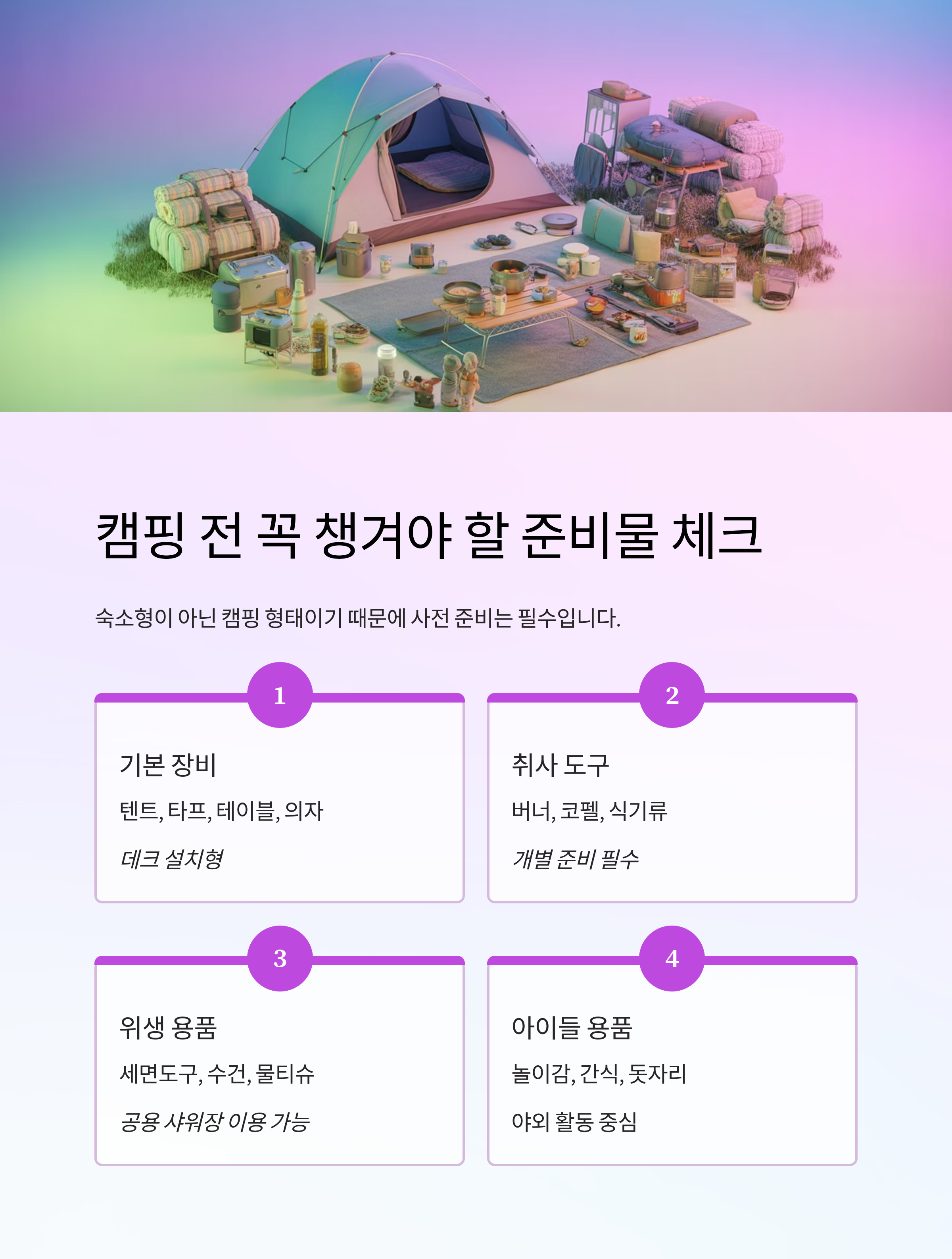 숙소형이 아닌 캠핑 형태이기 때문에, 사전 준비는 필수입니다.