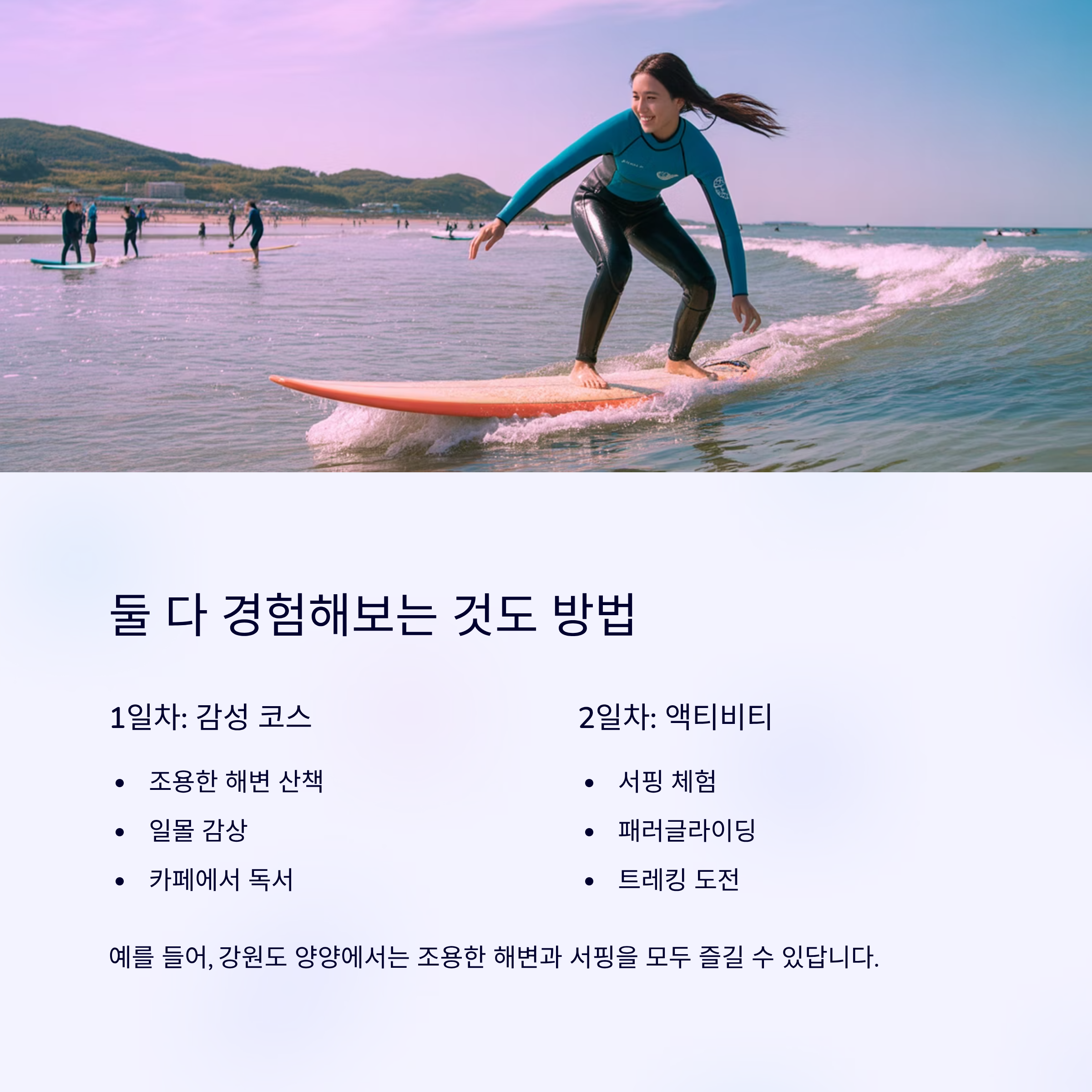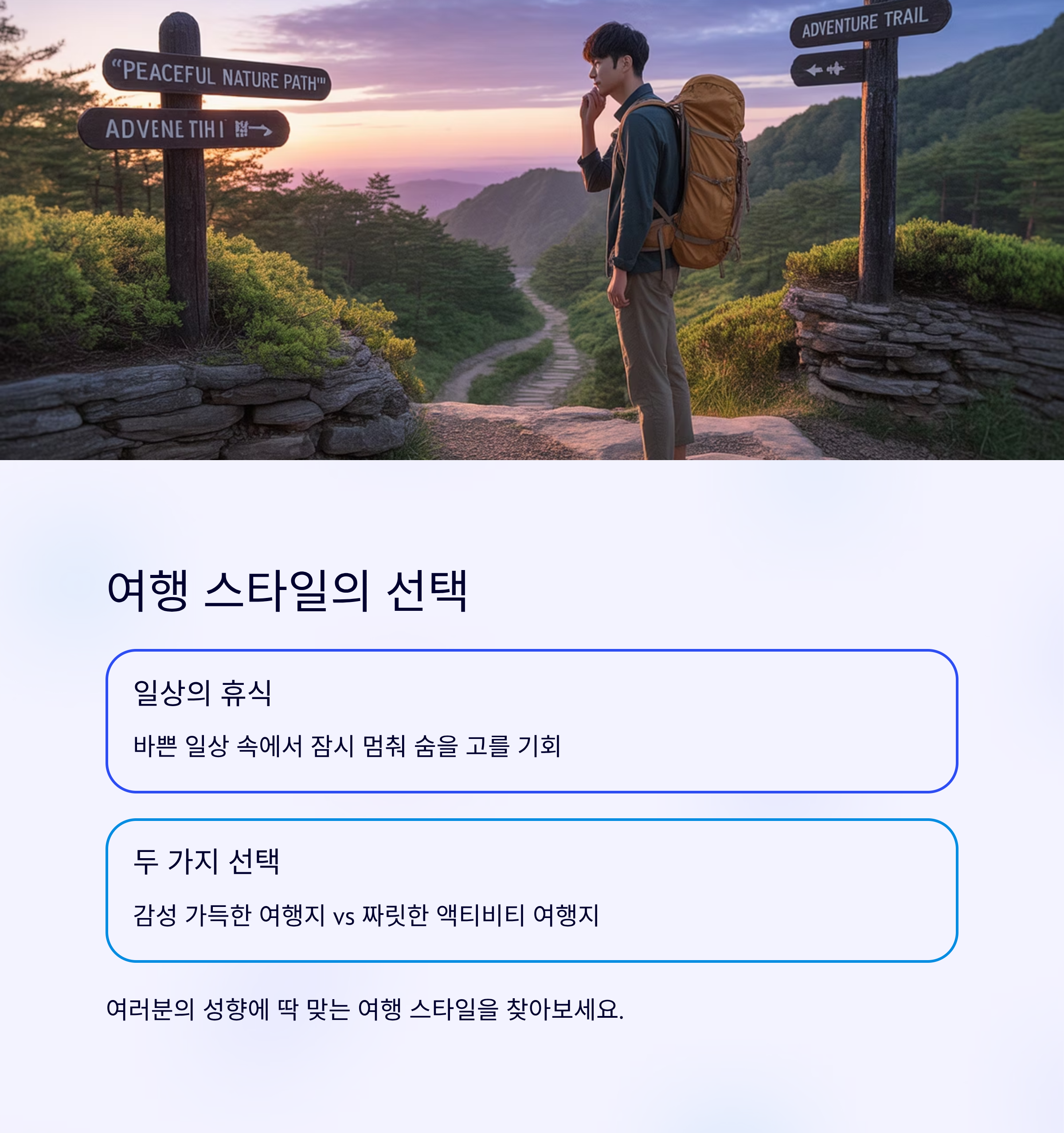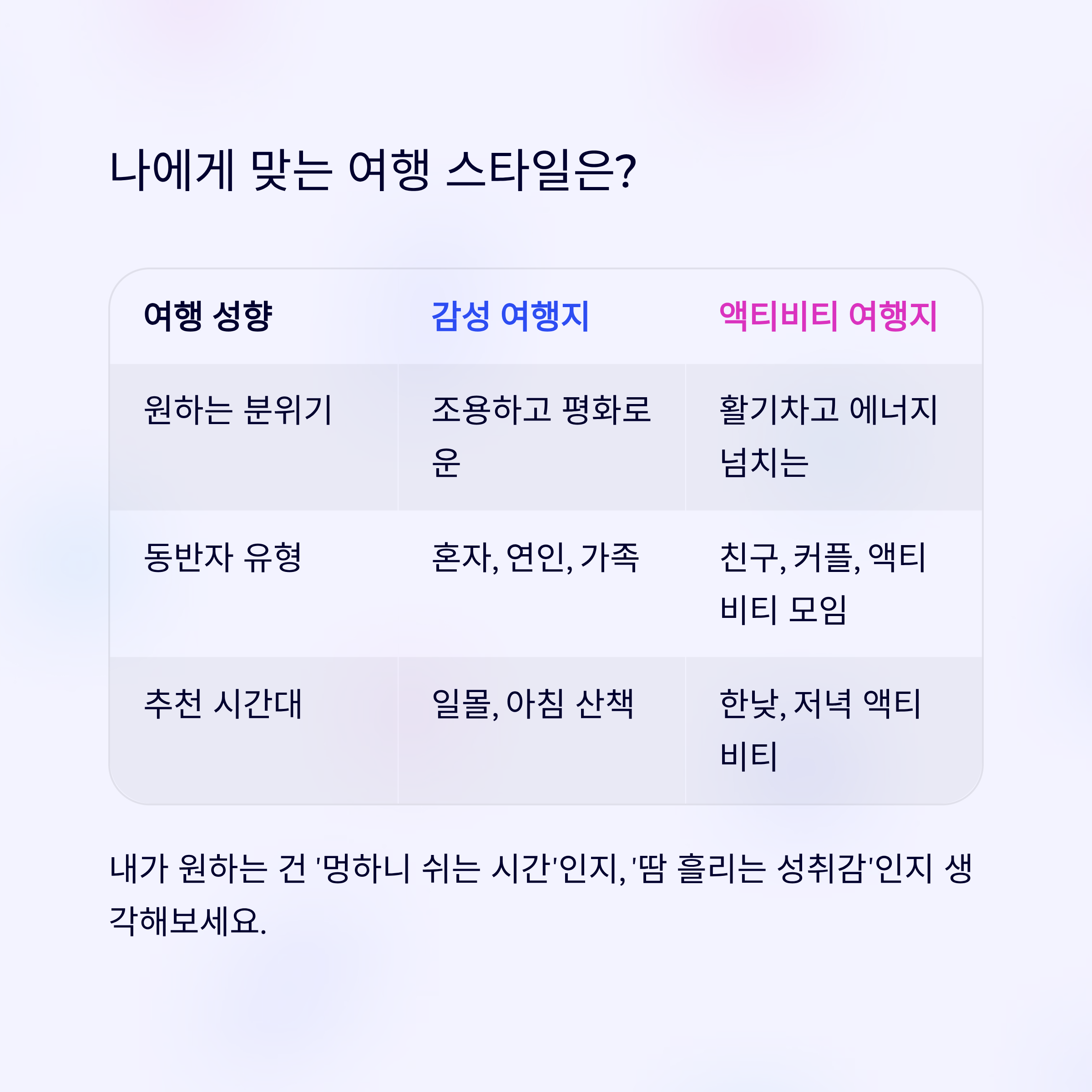 바쁘게 흘러가는 일상 속에서 여행은 잠시 멈춰 숨을 고를 기회를 줍니다. 그런데 여행을 떠나려다 보면 한 가지 고민이 생기죠. 감성 가득한 여행지를 찾을 것인지, 짜릿한 액티비티가 기다리는 여행지를 선택할 것인지 말이에요. 이 글에서는 감성 여행과 액티비티 여행 각각의 매력을 비교해보며, 여러분의 성향에 딱 맞는 여행 스타일을 찾는 데 도움을 드릴게요.