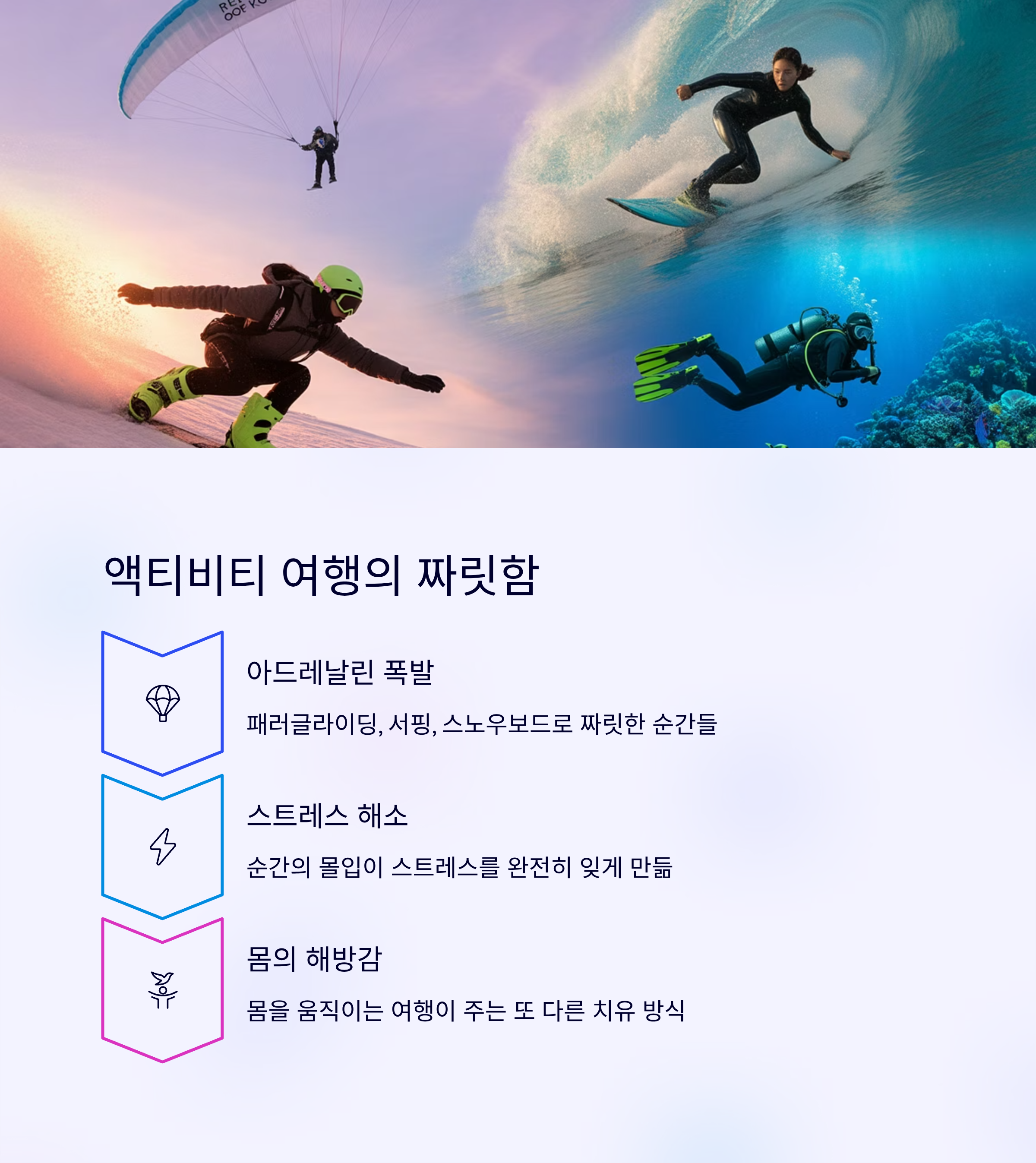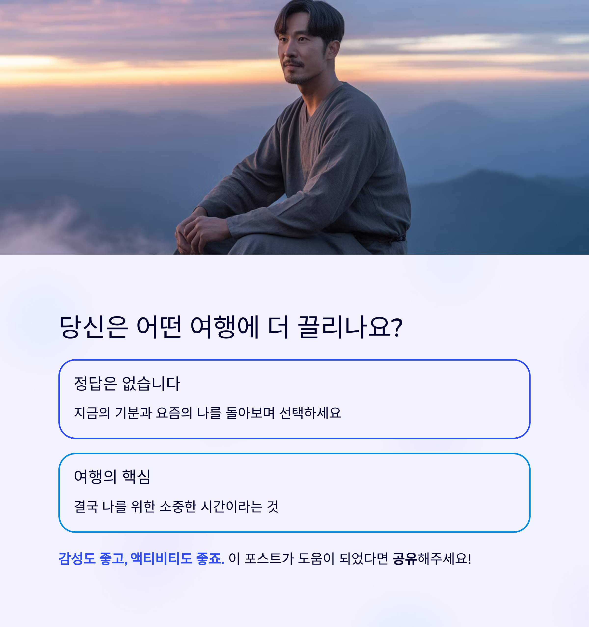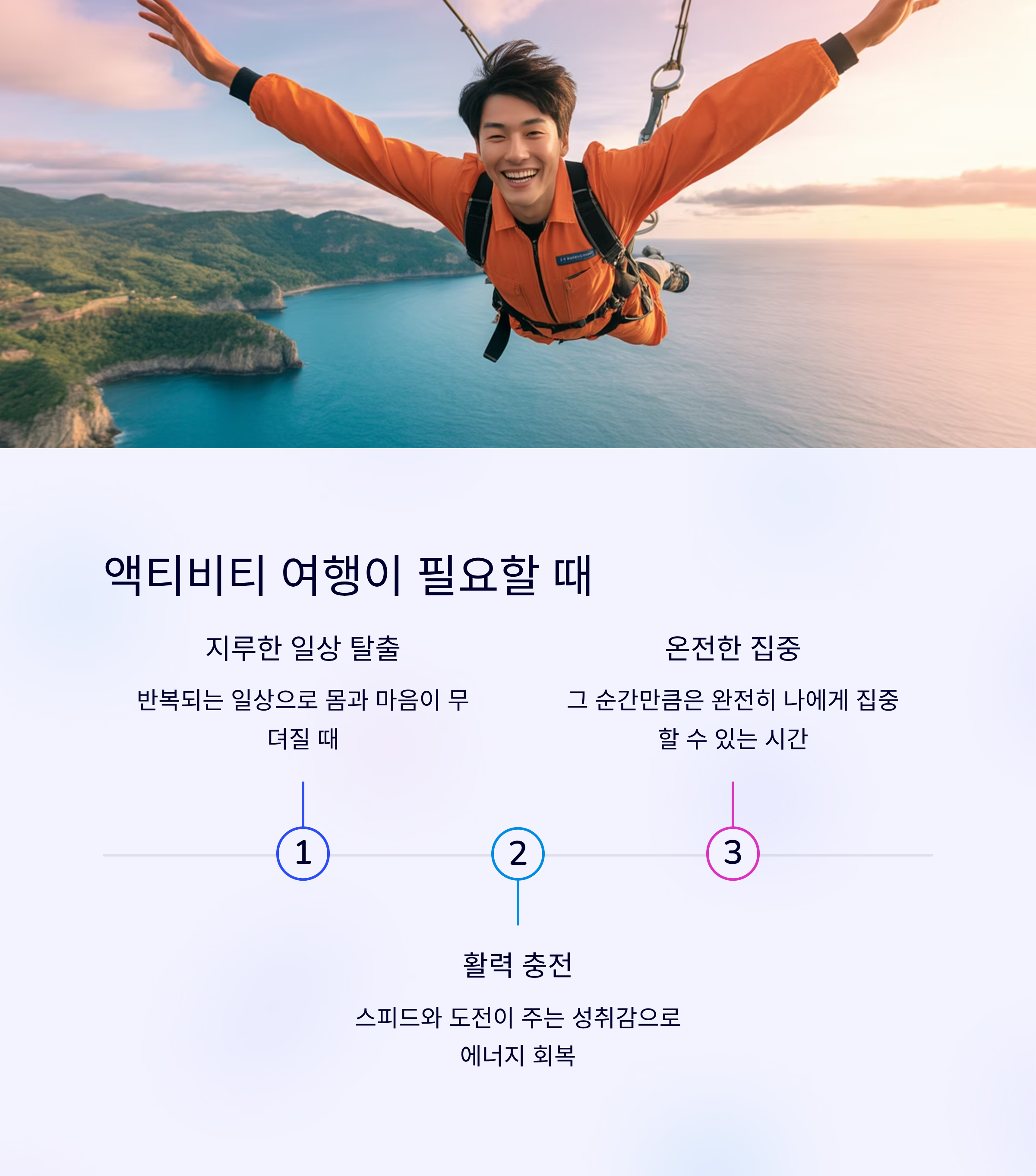 바쁘게 흘러가는 일상 속에서 여행은 잠시 멈춰 숨을 고를 기회를 줍니다. 그런데 여행을 떠나려다 보면 한 가지 고민이 생기죠. 감성 가득한 여행지를 찾을 것인지, 짜릿한 액티비티가 기다리는 여행지를 선택할 것인지 말이에요. 이 글에서는 감성 여행과 액티비티 여행 각각의 매력을 비교해보며, 여러분의 성향에 딱 맞는 여행 스타일을 찾는 데 도움을 드릴게요.