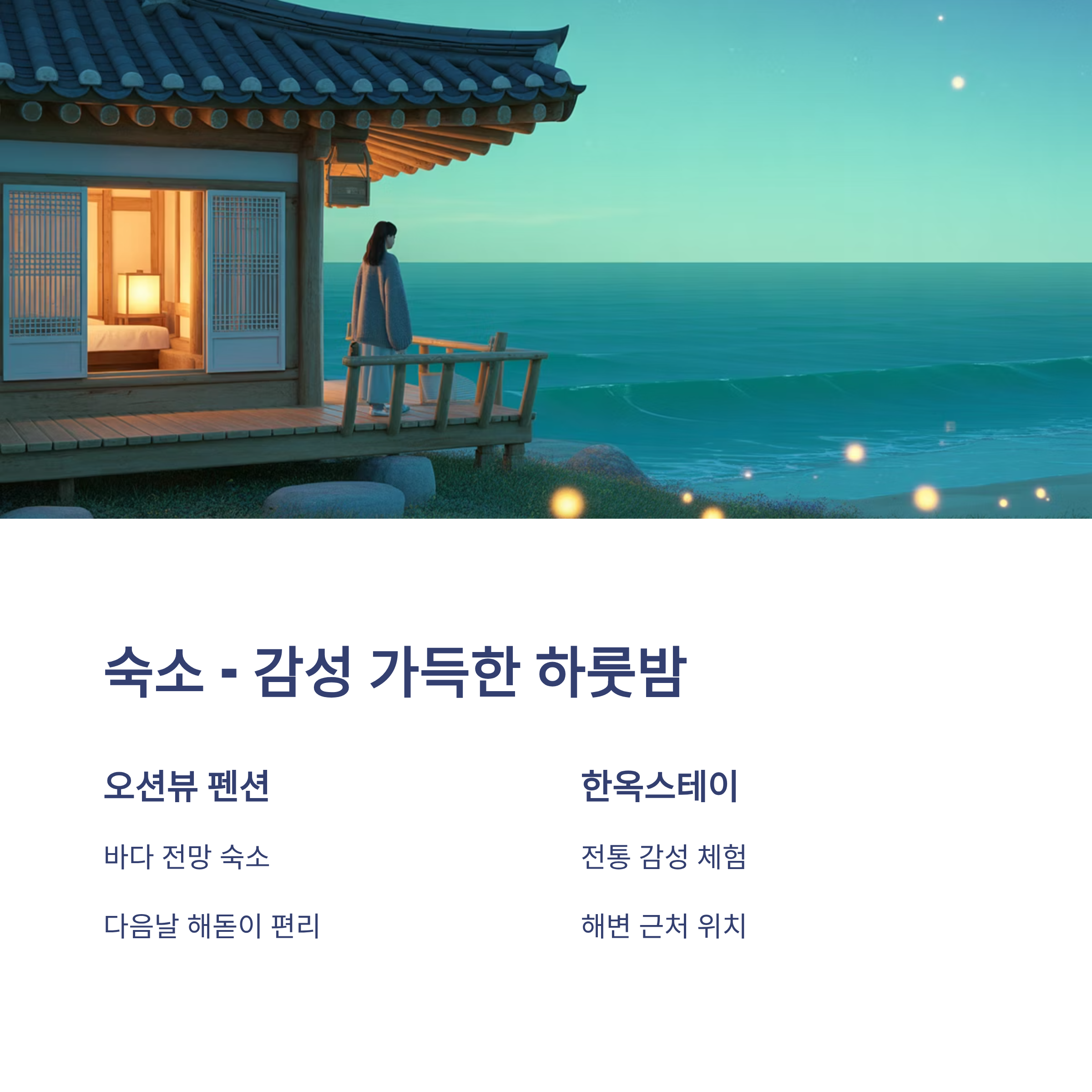 오션뷰 펜션이나 감성 가득한 한옥스테이 등 선택의 폭이 넓습니다.