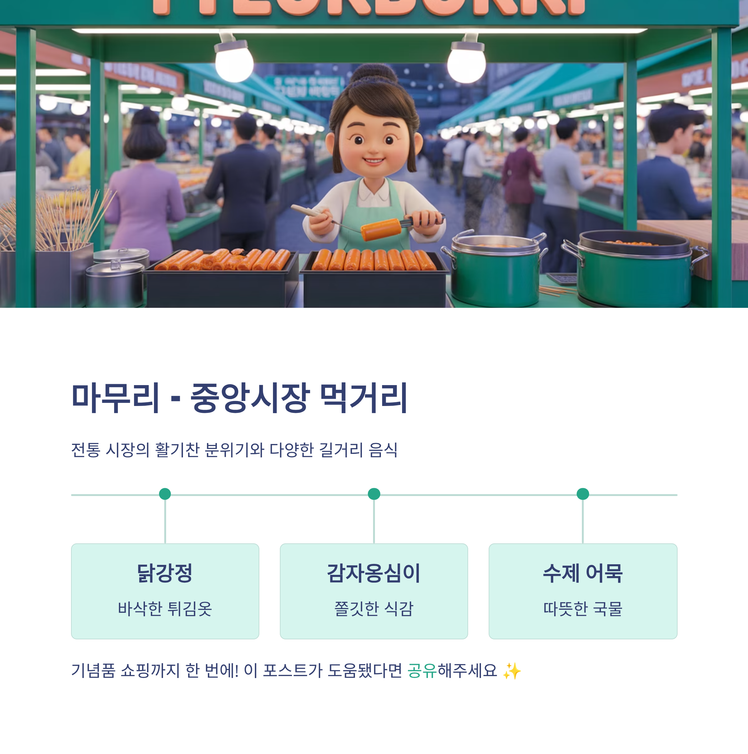 닭강정, 감자옹심이, 수제 어묵 등 빠질 수 없는 먹거리들이 가득해요.