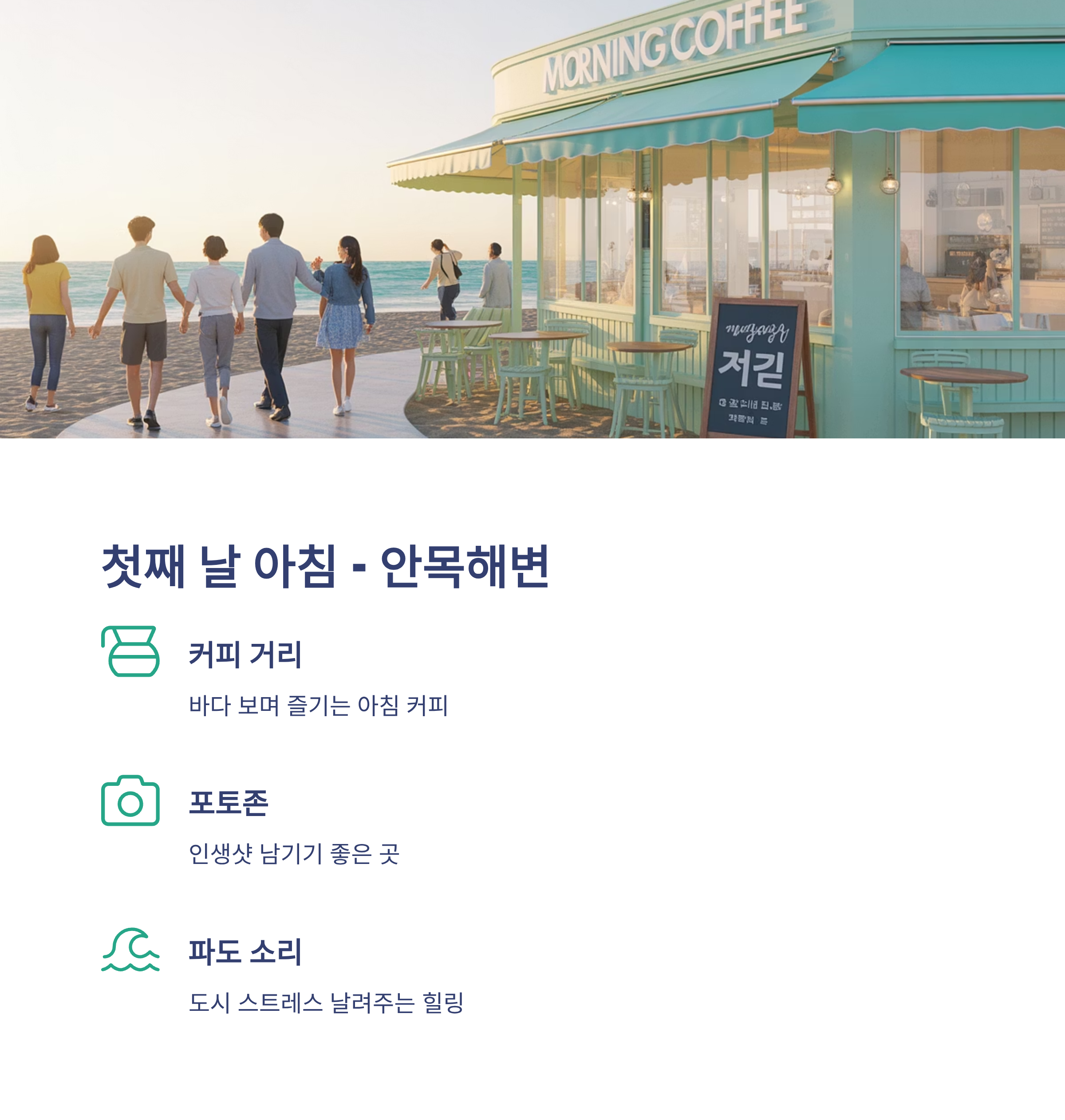 에메랄드빛 바다와 함께 줄지어 늘어선 커피 거리, 바다를 바라보며 즐기는 아침 커피는 그 자체로 힐링이죠.