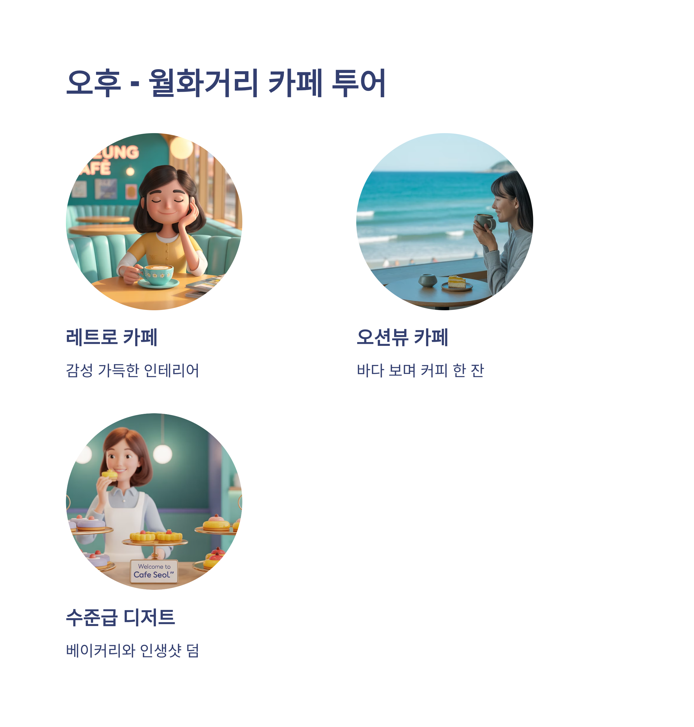 레트로풍 인테리어부터 오션뷰 카페까지 다양하게 즐길 수 있어요.