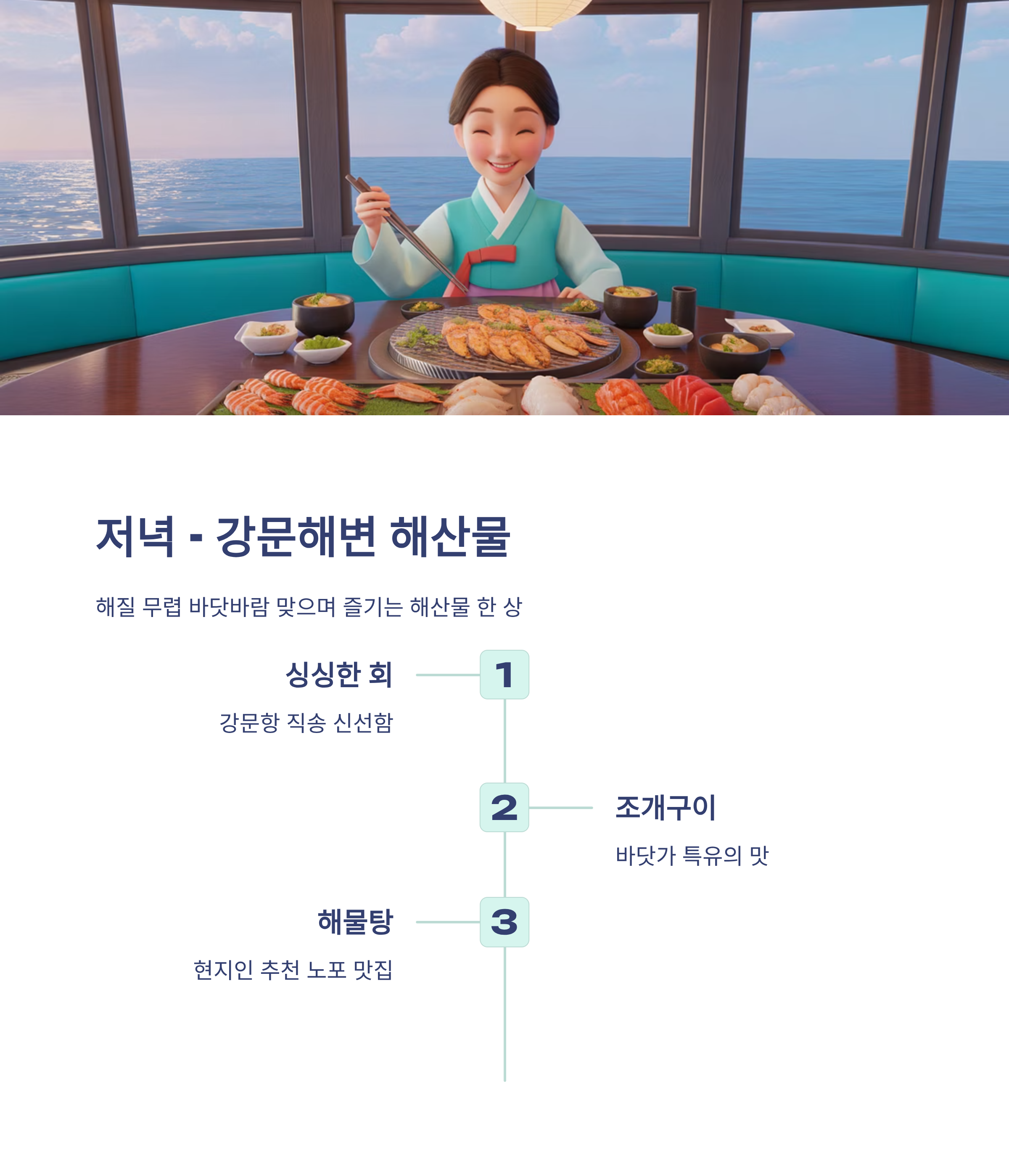 특히 강문항 근처에는 현지인들이 자주 찾는 노포 맛집도 많아 저녁 식사 장소로 제격입니다.