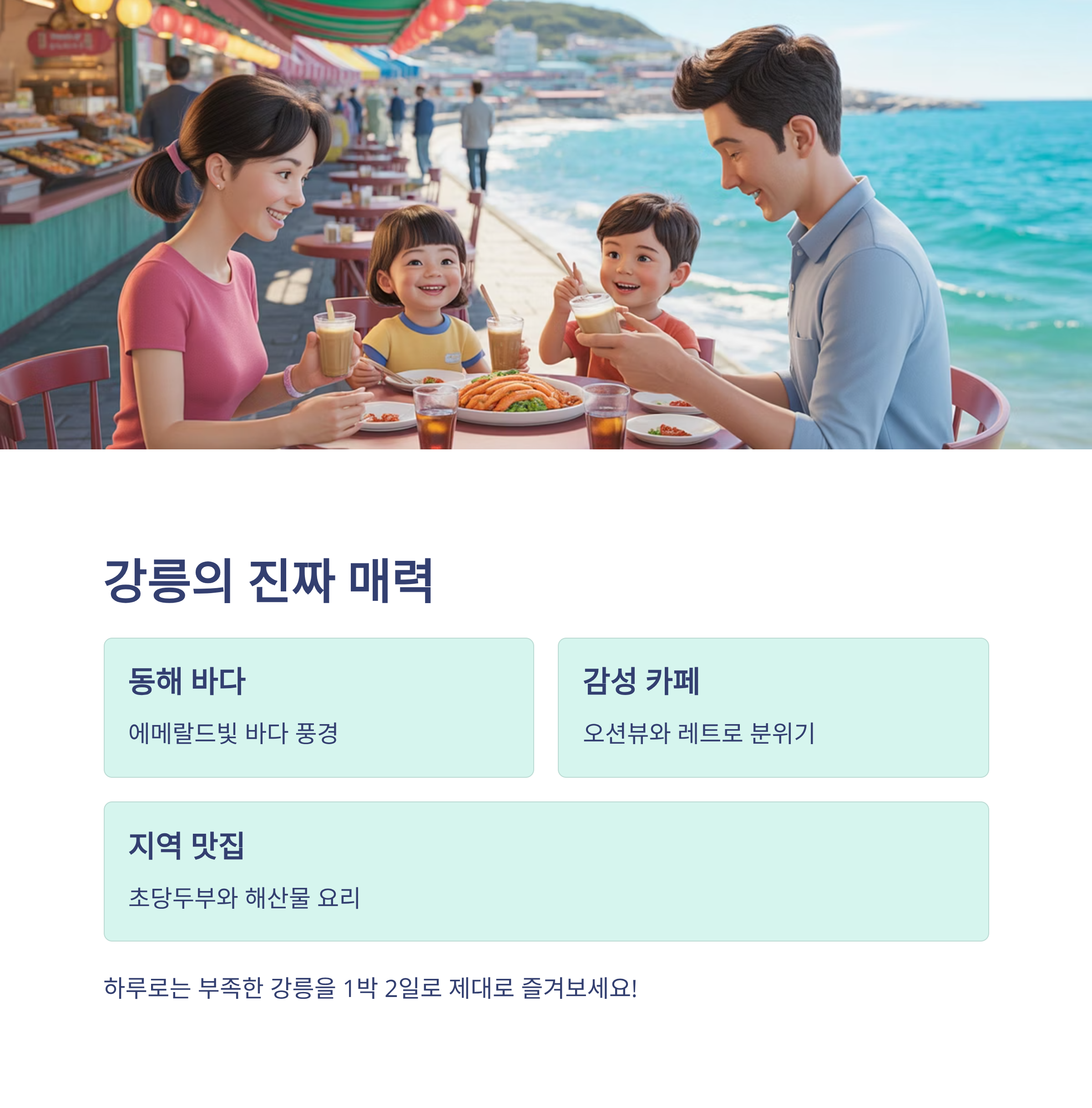 강릉은 동해의 바다 풍경과 감성 가득한 카페, 그리고 지역만의 맛집이 가득한 매력적인 여행지입니다. 하루로는 부족한 강릉의 진짜 매력을 제대로 느끼기 위해 꼭 들러야 할 스팟들을 1박 2일 기준으로 정리해봤습니다. 바다, 카페, 맛집을 중심으로 누구나 따라 하기 쉬운 코스 위주로 구성했어요.