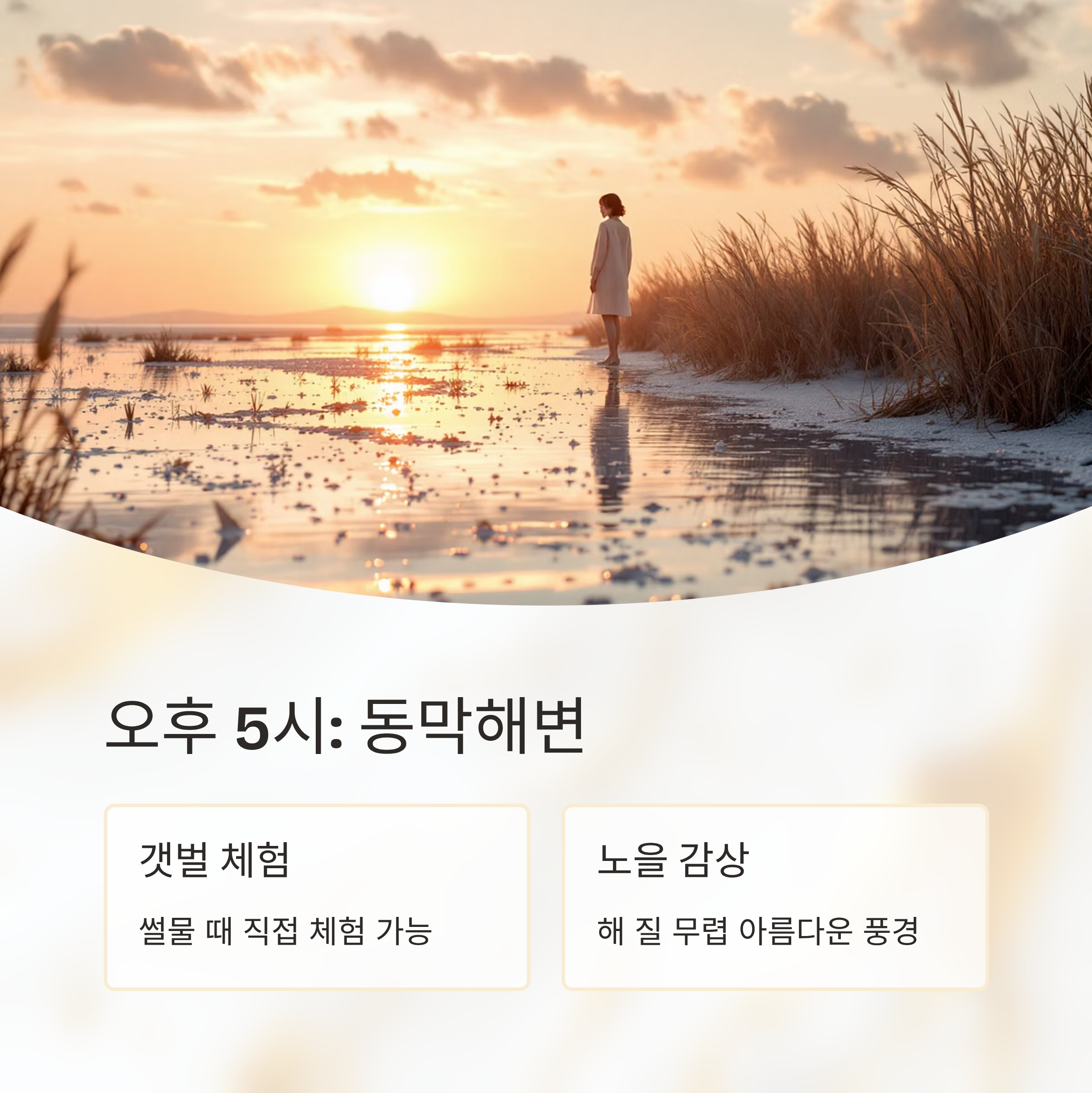 | 오후 5시 | 동막해변 | 바다 산책 및 일몰 감상 |