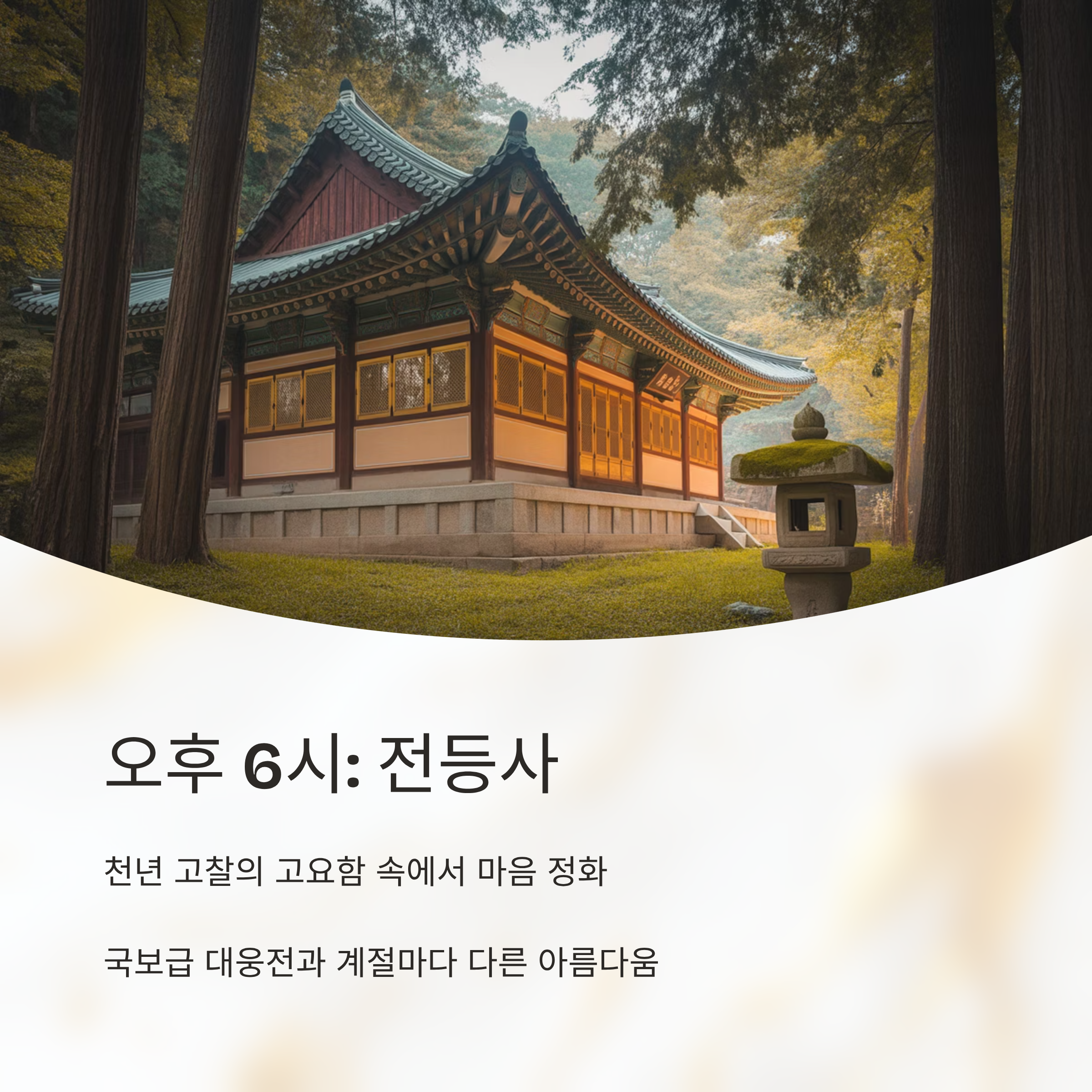| 오후 6시 | 전등사 | 고찰 방문 및 여운 남기기 |