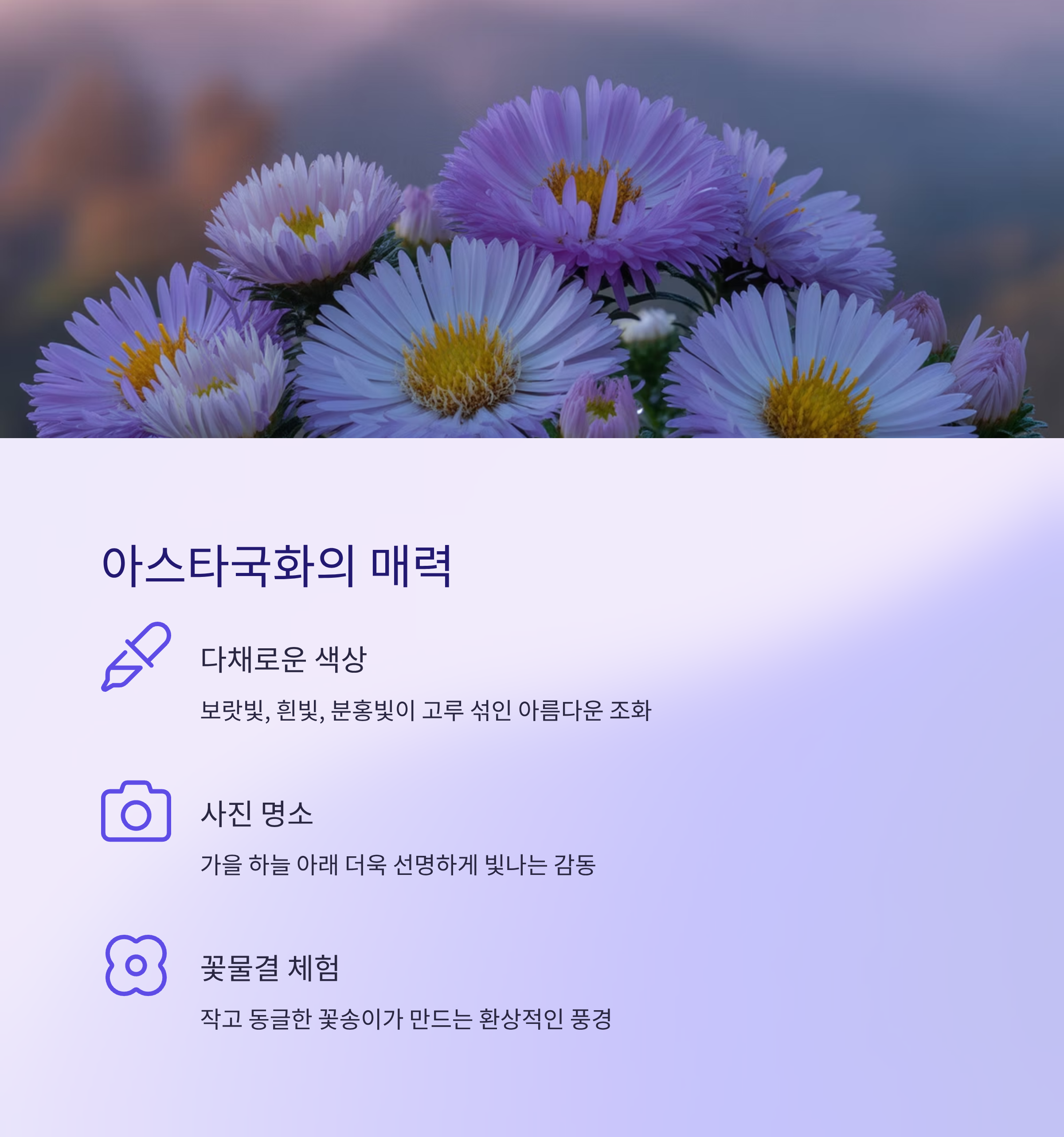 아스타국화는 보랏빛과 흰빛, 분홍빛이 고루 섞인 다채로운 색상이 특징인데요.