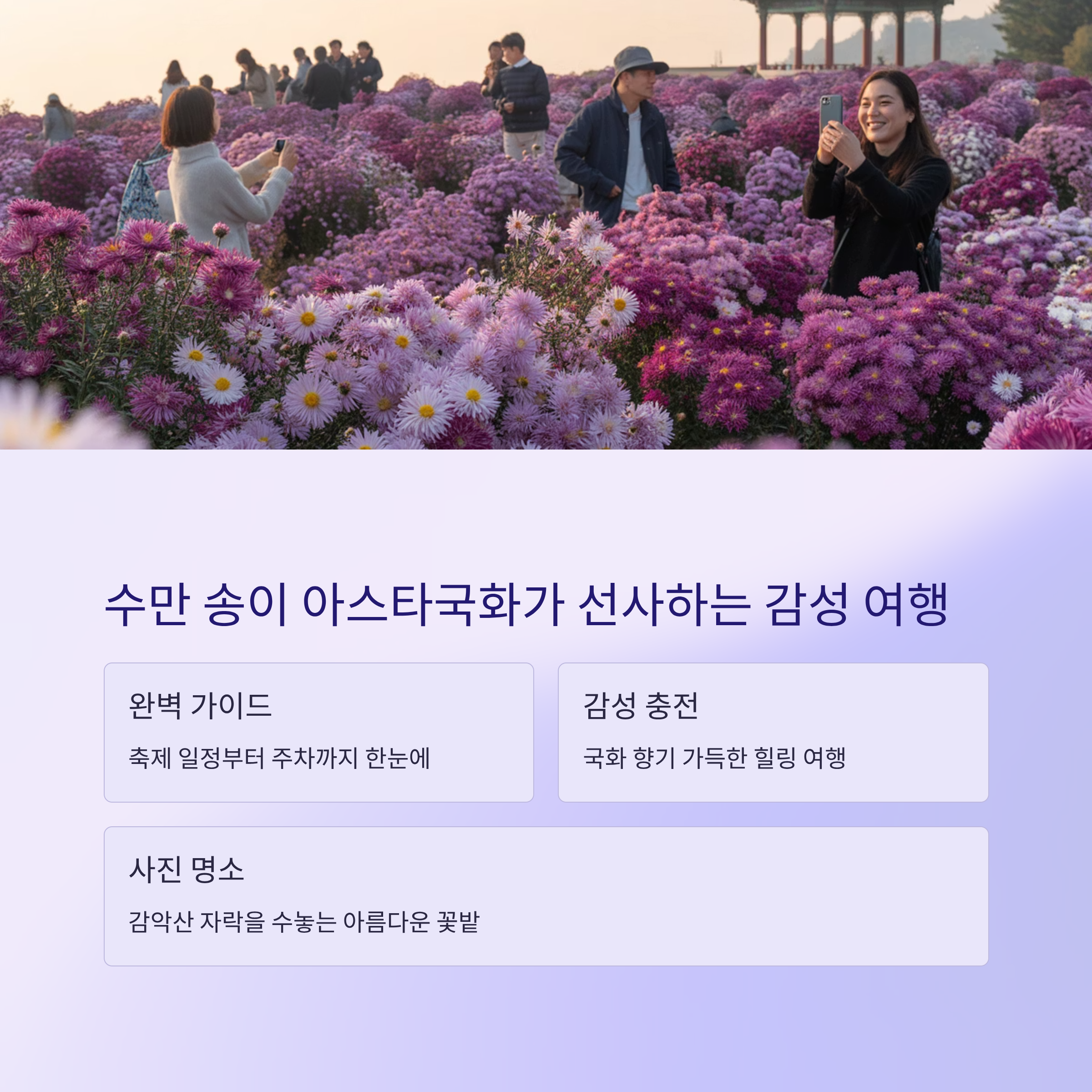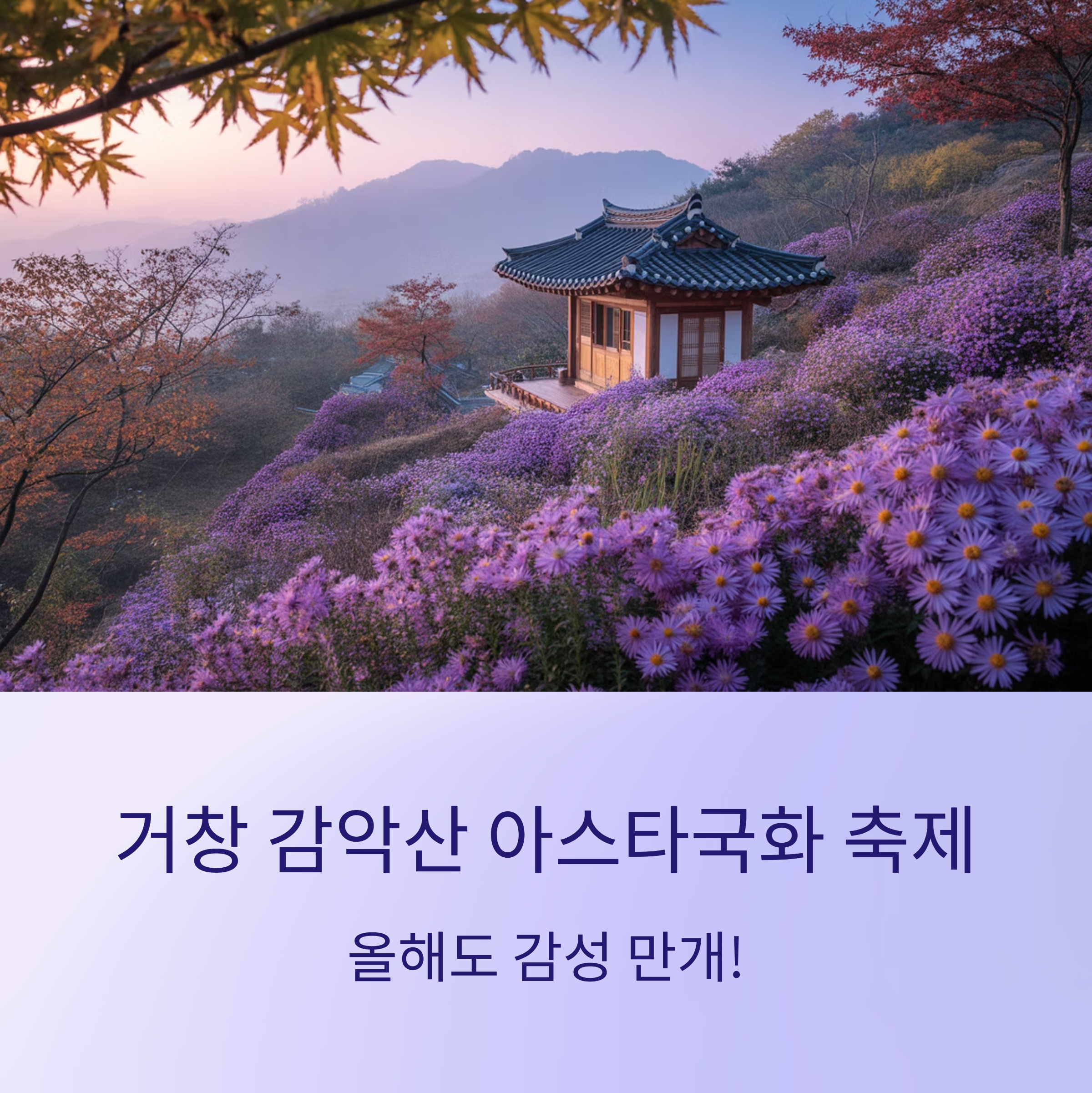 거창 감악산에서 펼쳐지는 아스타국화 축제가 다시 돌아왔습니다. 해마다 가을이면 감악산 자락을 수놓는 수만 송이의 아스타국화는 사진 명소로도 유명한데요. 이번 글에서는 축제 일정, 주차 정보, 네비게이션 팁, 볼거리까지 한눈에 정리해 드리겠습니다. 국화 향기 가득한 감성 여행, 지금부터 함께 알아보세요.