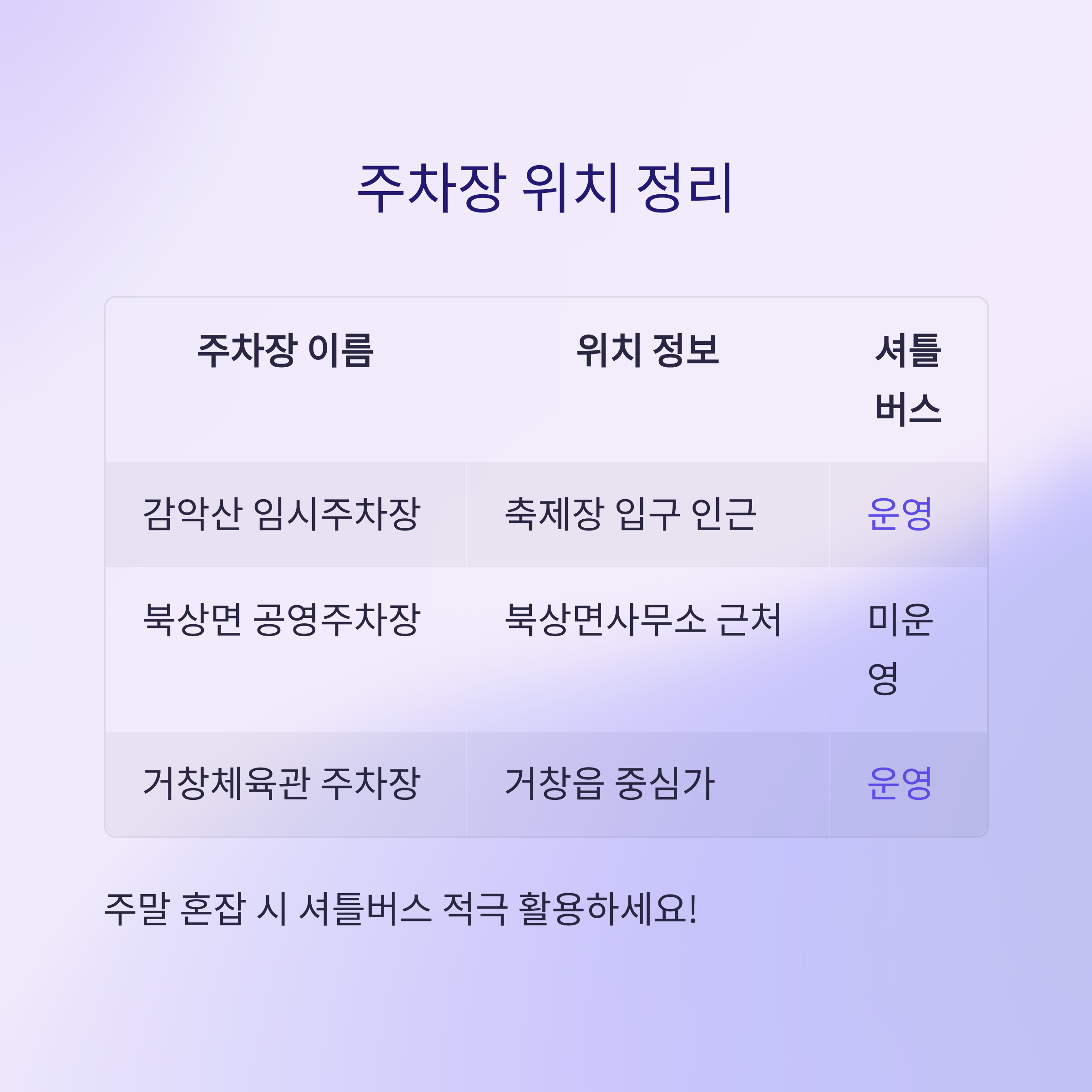 아래 표에서 주차장별 위치와 셔틀 유무를 확인하세요.