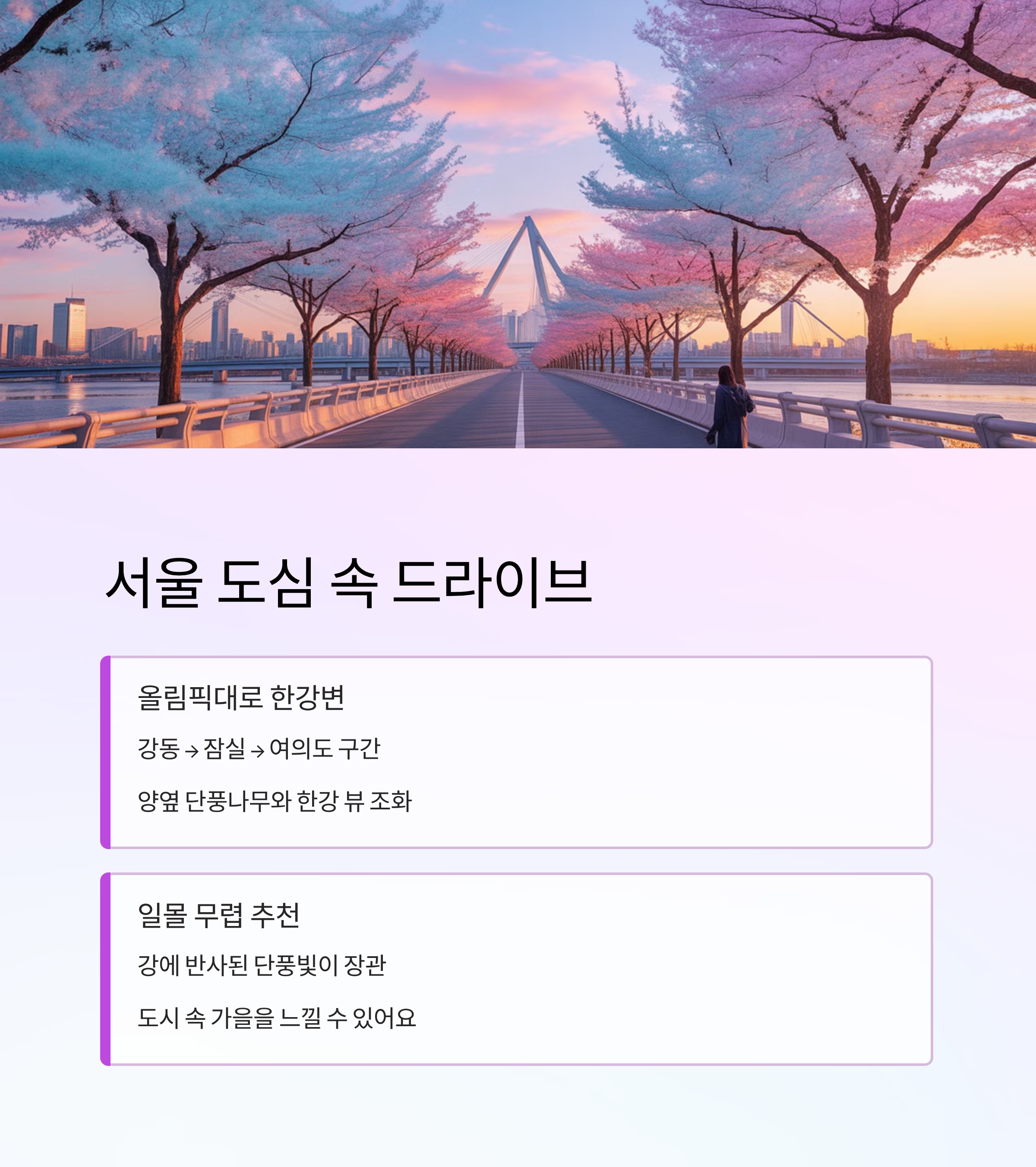 | 서울 | 올림픽대로 | 도심 속 한강 단풍뷰 |