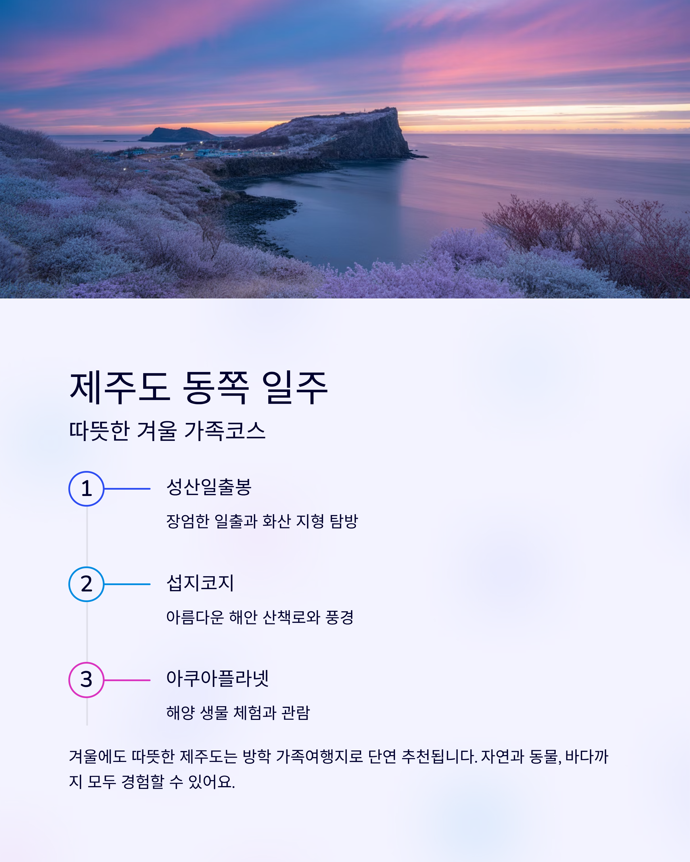 겨울에도 따뜻한 제주도는 방학 가족여행지로 단연 추천됩니다.