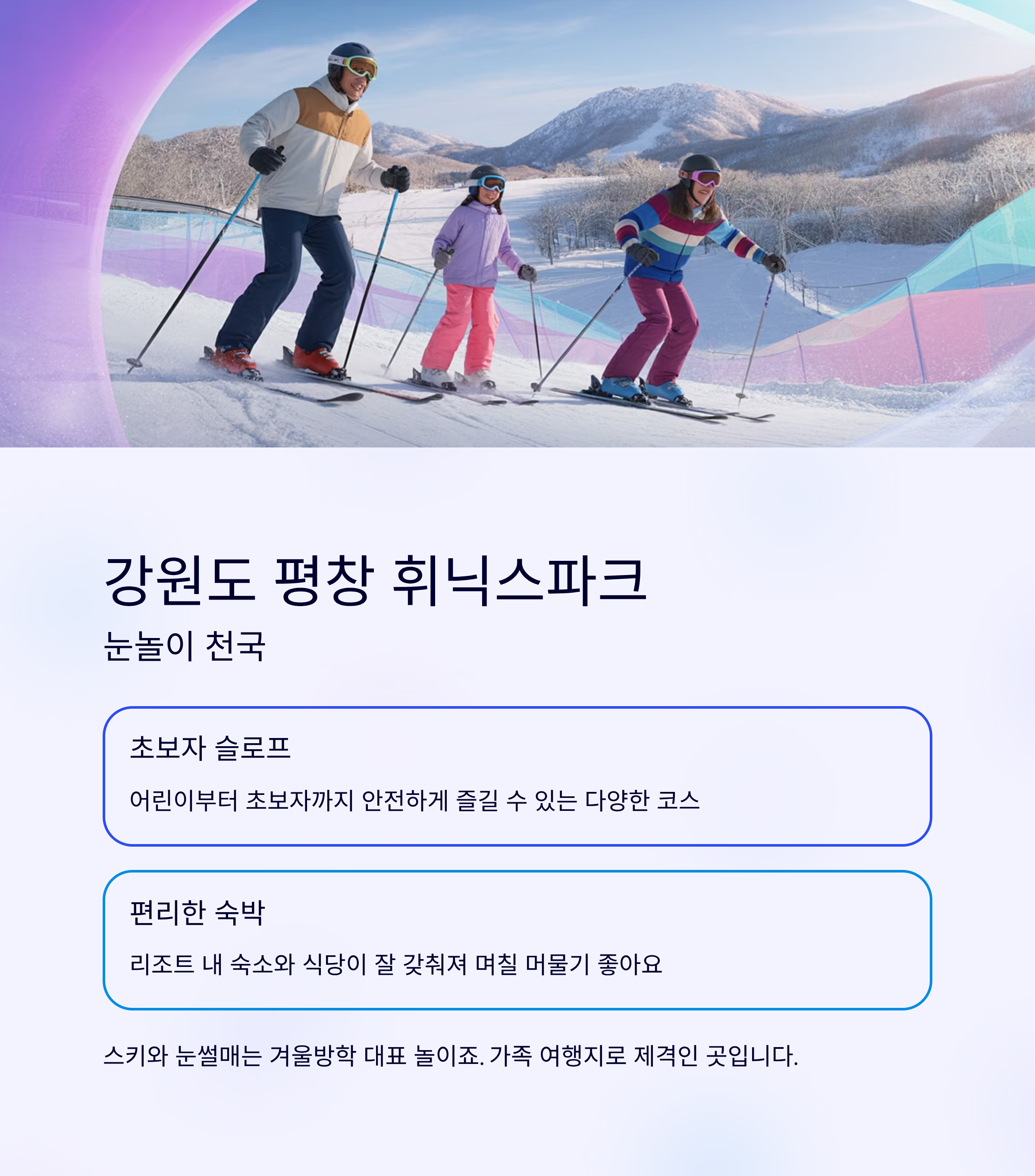 | 강원 평창 | 스키, 눈썰매 | 숙박·레저 한 번에 가능 |