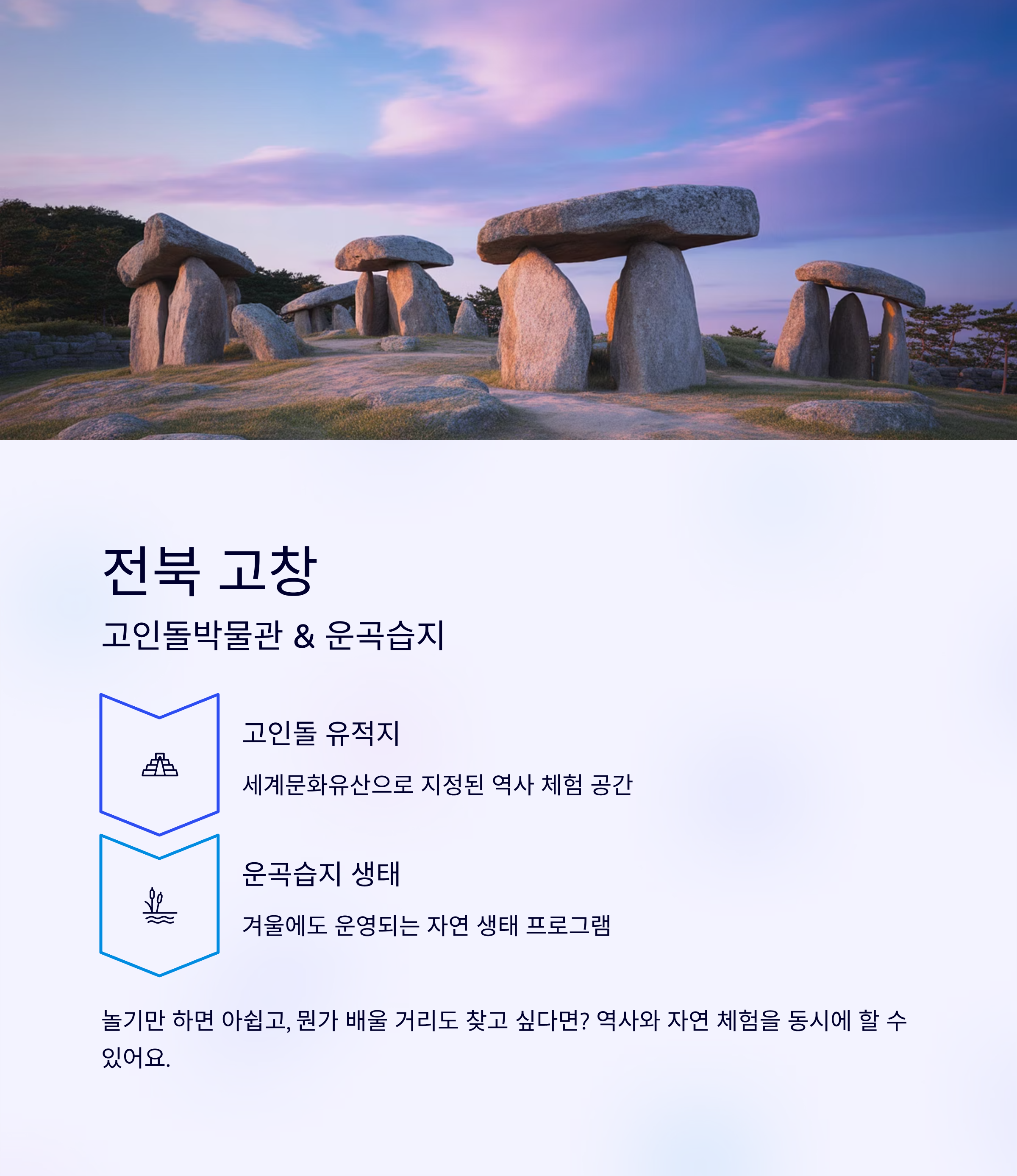 | 전북 고창 | 생태체험, 유적 탐방 | 역사+자연 교육 여행 |