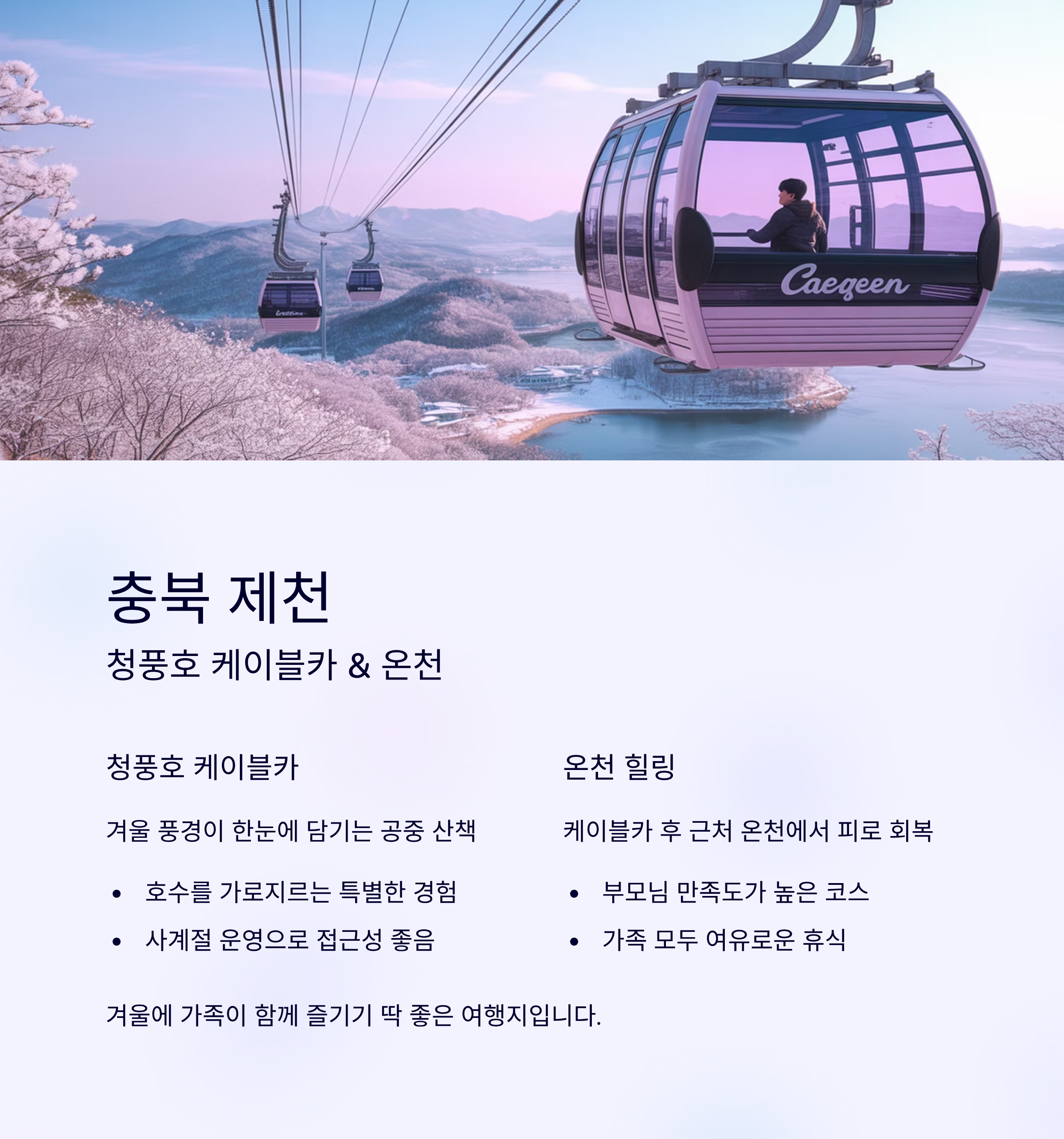| 충북 제천 | 케이블카, 온천 | 경치+휴식 모두 만족 |