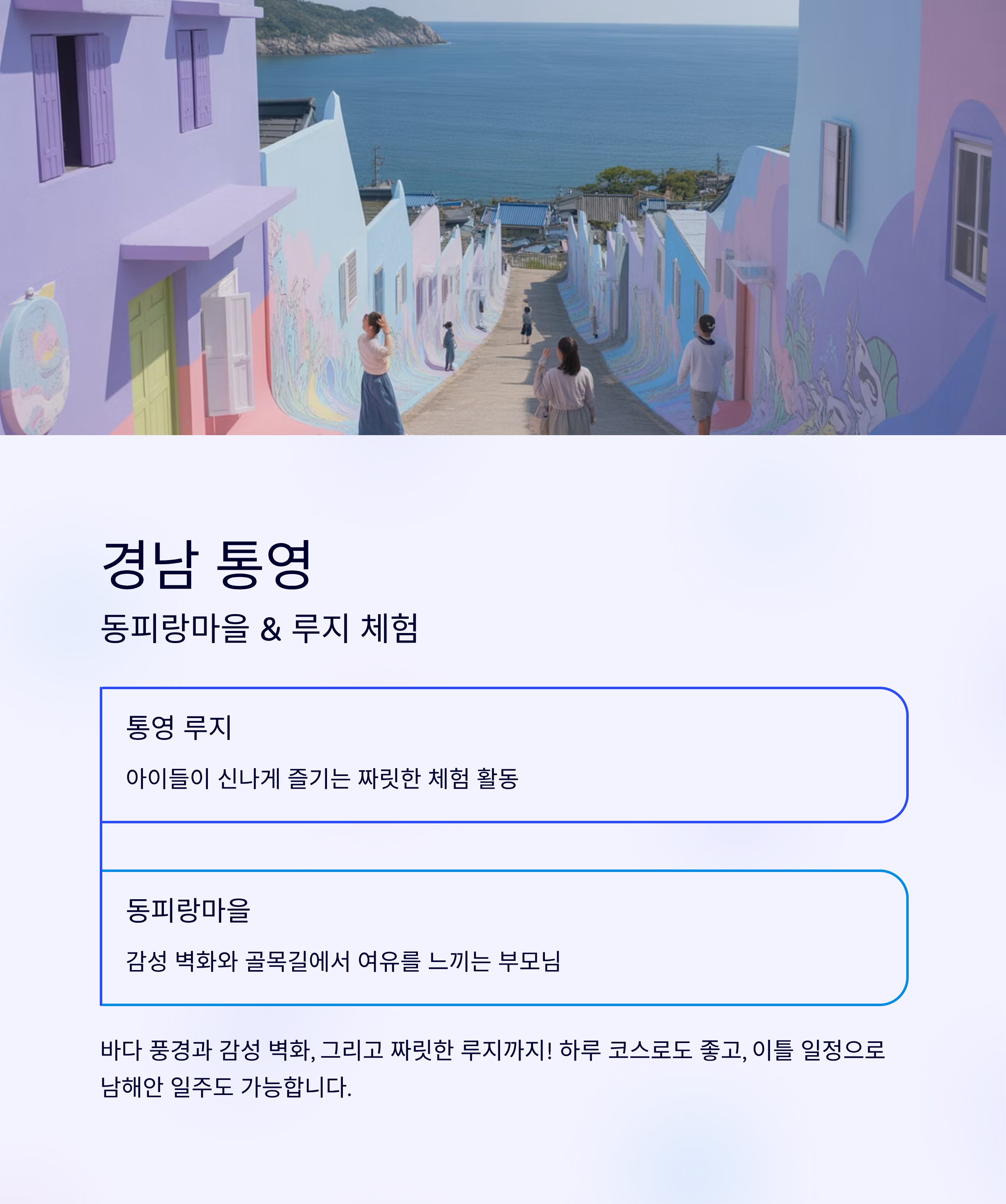 아이들은 통영 루지 타며 신나고, 부모님은 동피랑마을 골목길에서 여유를 느낄 수 있어요.