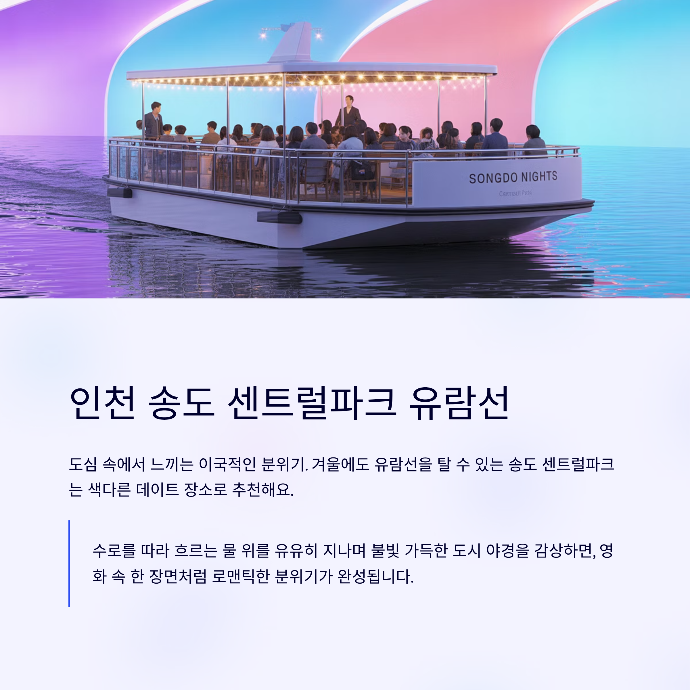 겨울에도 유람선을 탈 수 있는 송도 센트럴파크는 색다른 데이트 장소로 추천해요.