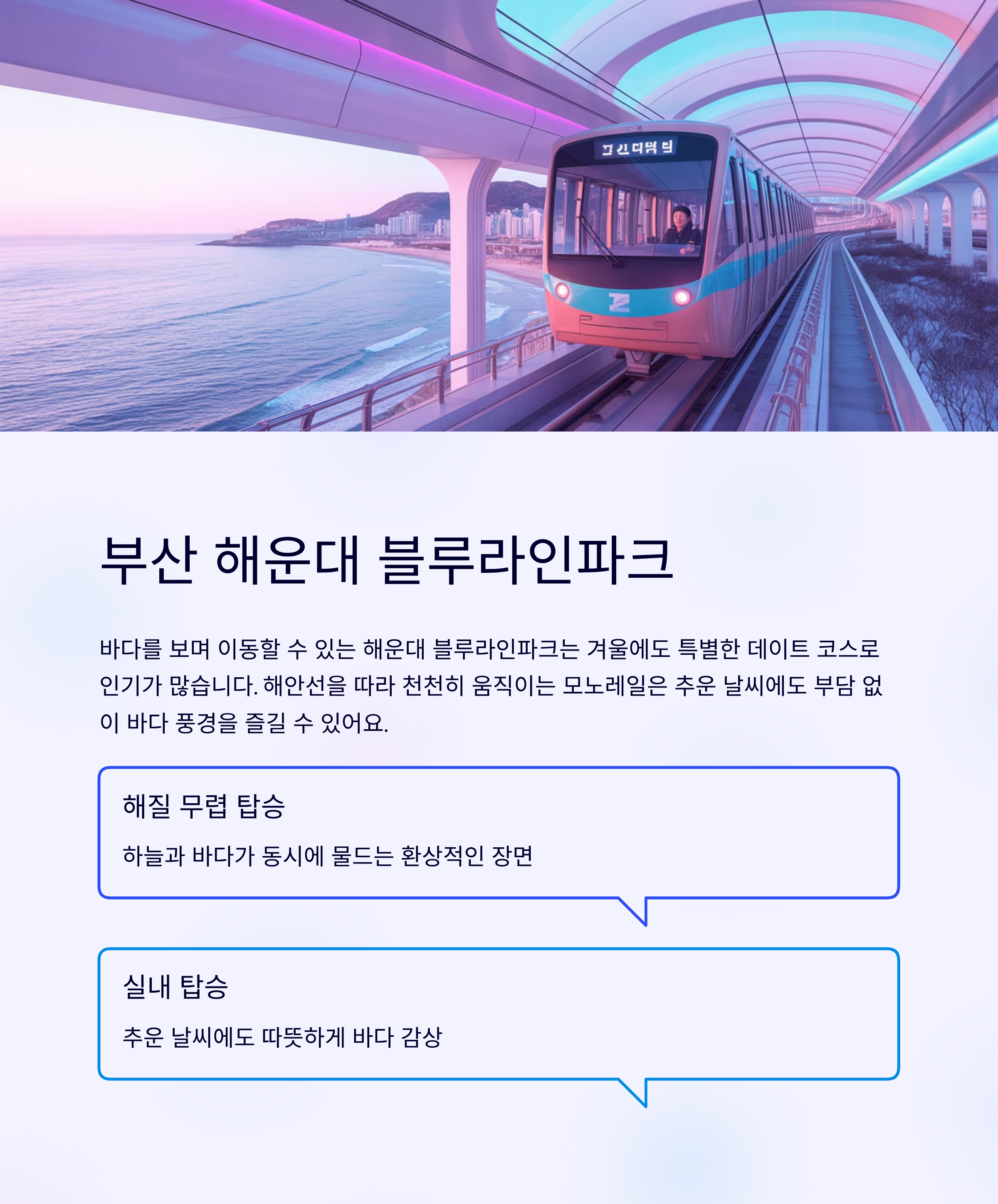 바다를 보며 이동할 수 있는 해운대 블루라인파크는 겨울에도 특별한 데이트 코스로 인기가 많습니다.