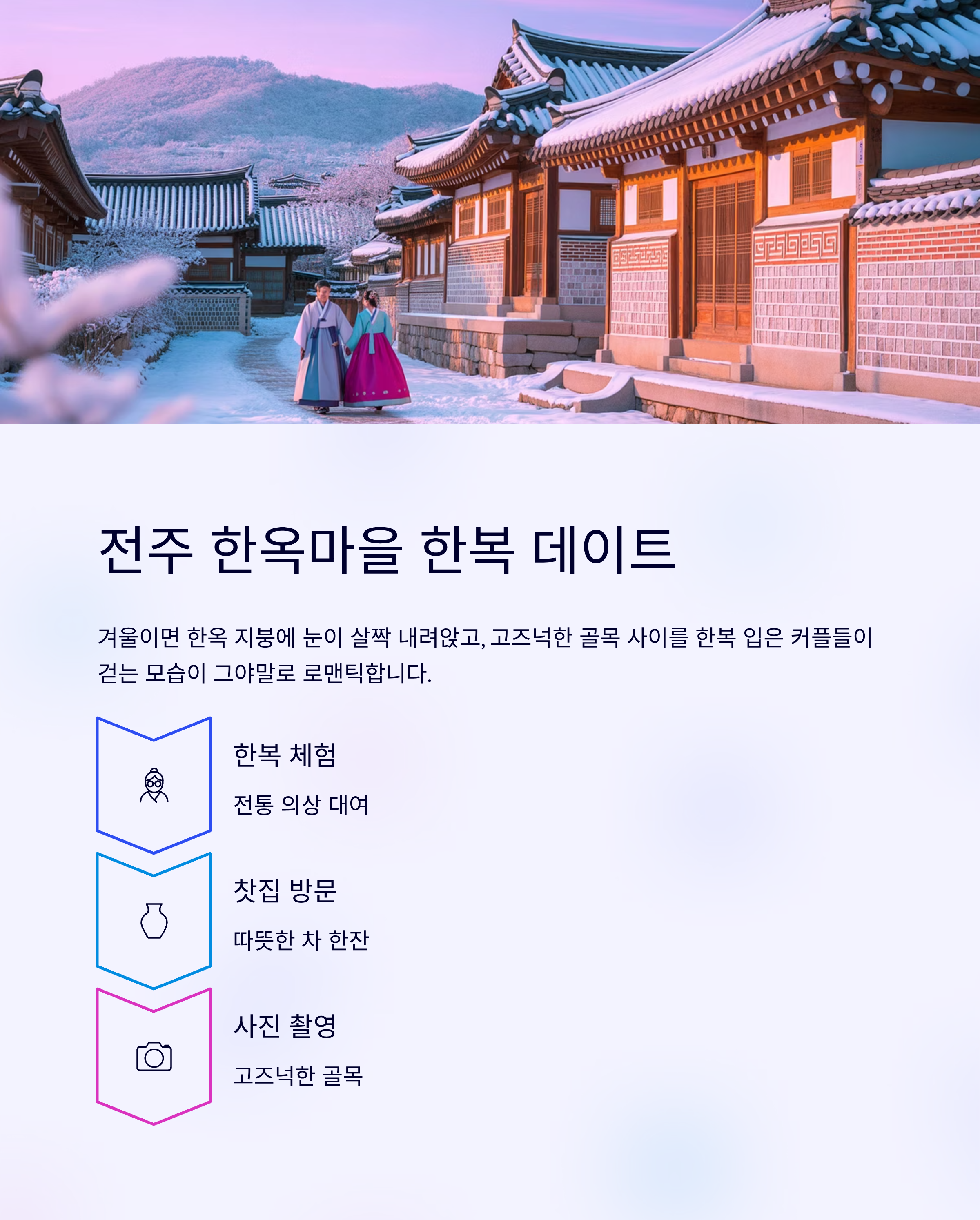 겨울이면 한옥 지붕에 눈이 살짝 내려앉고, 고즈넉한 골목 사이를 한복 입은 커플들이 걷는 모습이 그야말로 로맨틱합니다.