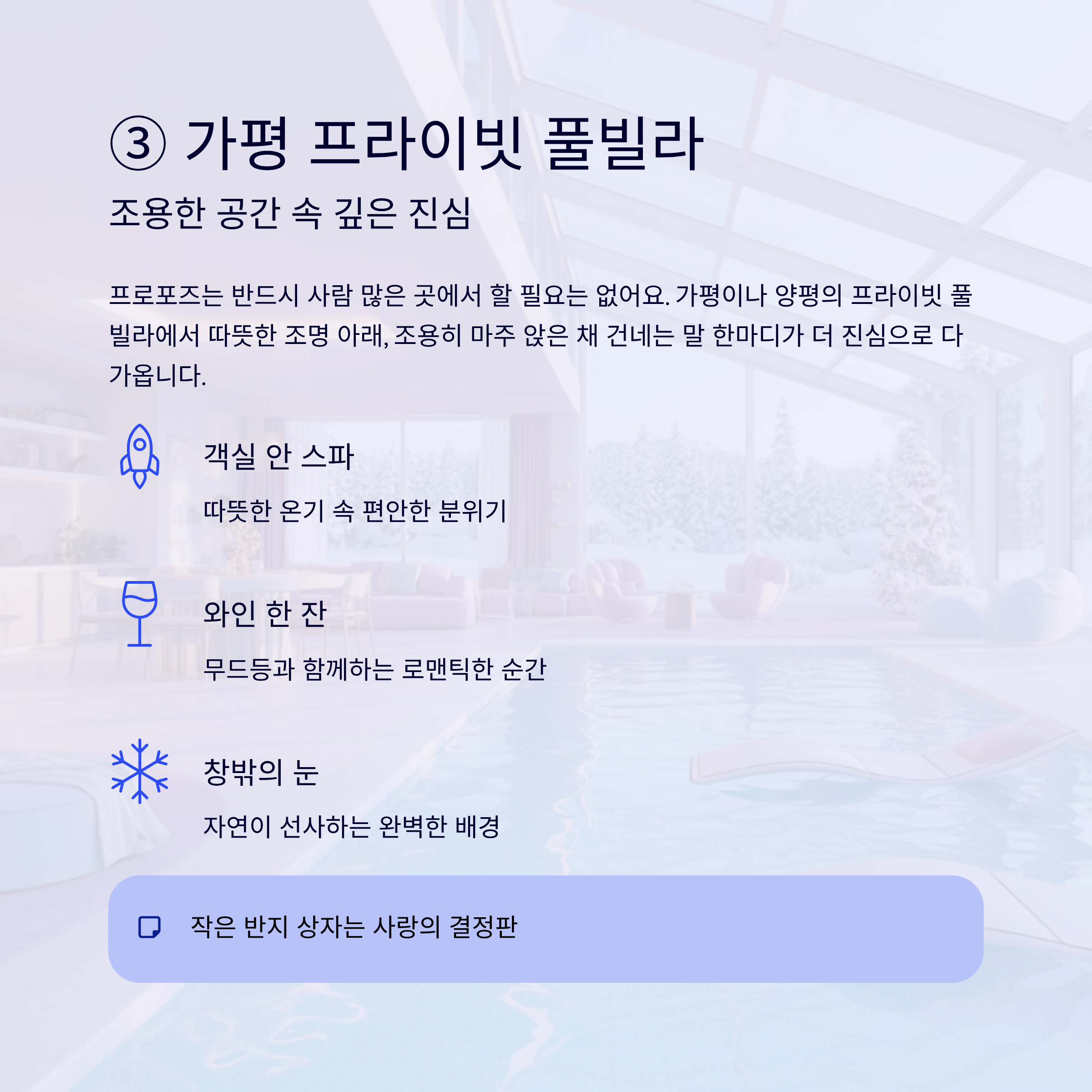 프로포즈는 반드시 사람 많은 곳에서 할 필요는 없어요. 가평이나 양평의 프라이빗 풀빌라에서 따뜻한 조명 아래, 조용히 마주 앉은 채 건네는 말 한마디가 더 진심으로 다가오죠.