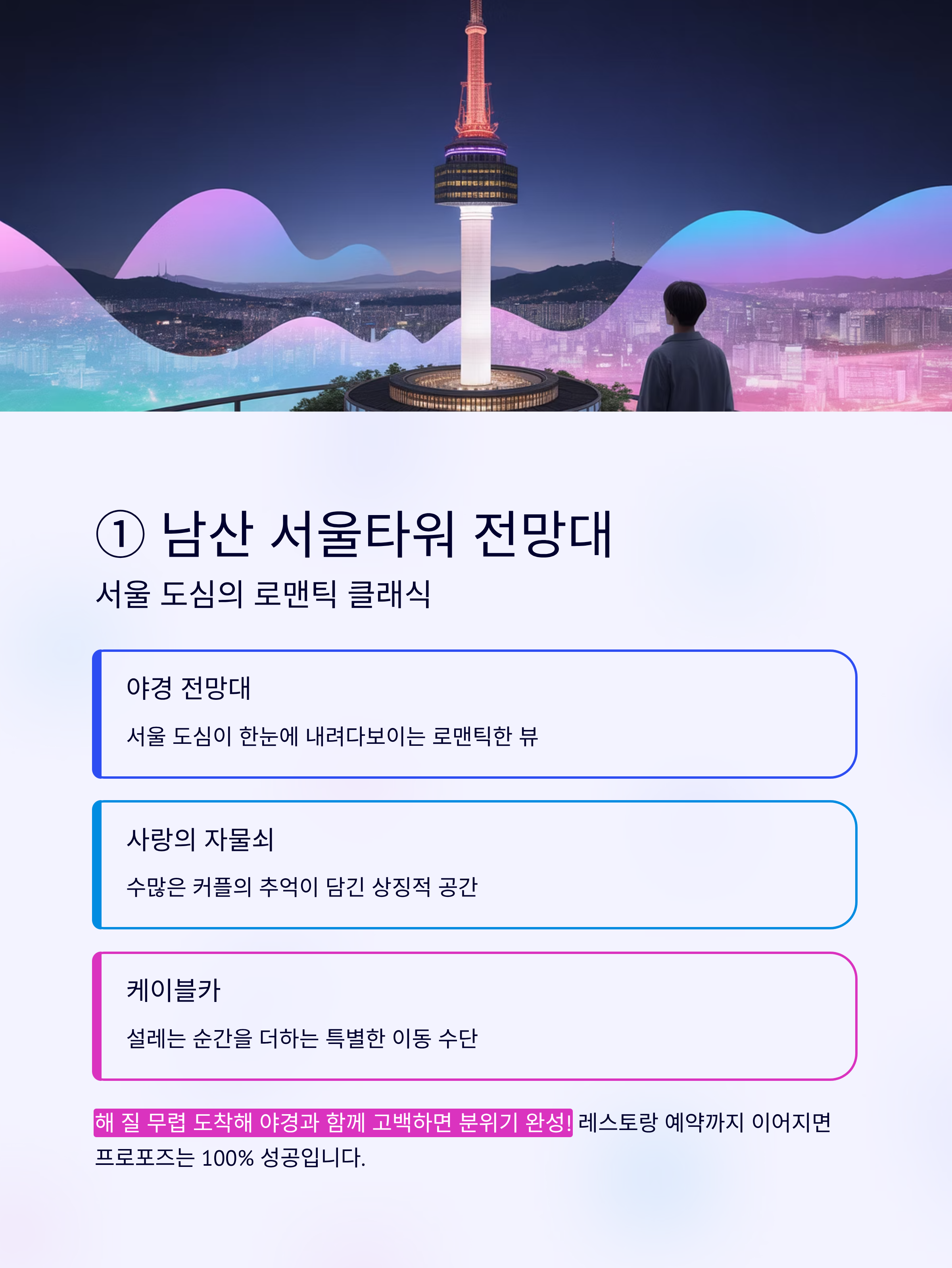 서울 도심 한가운데에서 가장 로맨틱한 프로포즈 장소로 손꼽히는 곳. 야경이 한눈에 내려다보이는 전망대, 수많은 커플의 추억이 담긴 사랑의 자물쇠, 그리고 케이블카까지 모든 요소가 설레는 공간입니다.