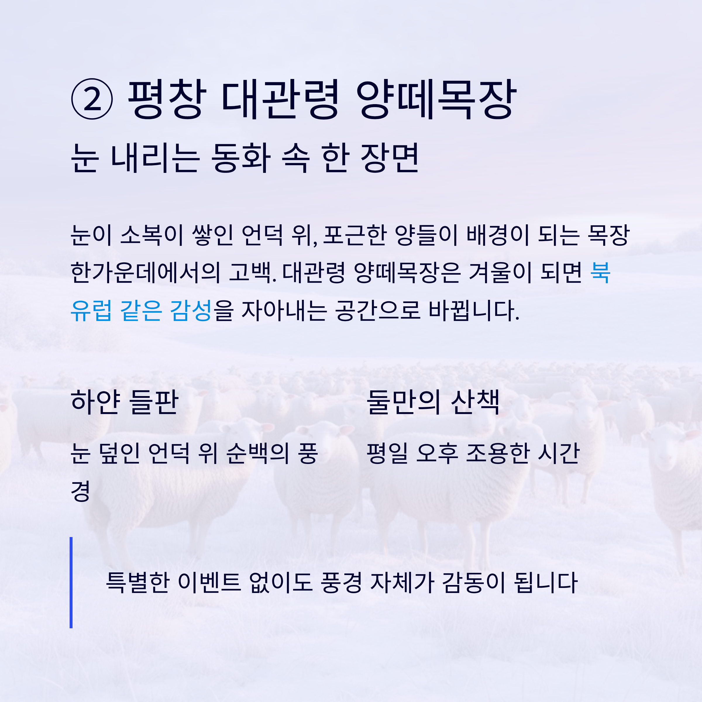 ② 평창 대관령 양떼목장 – 눈 내리는 동화 속 한 장면