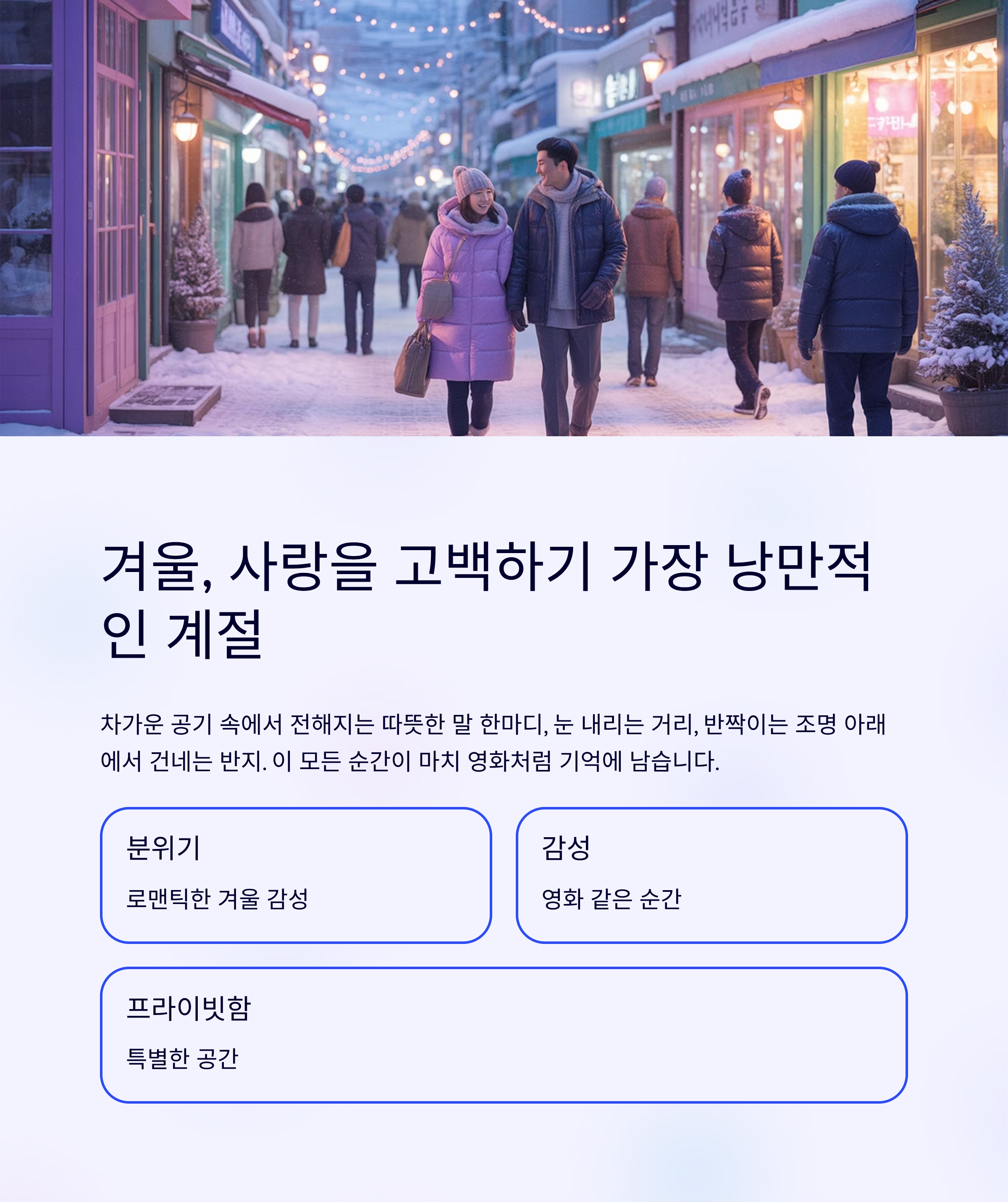 하얀 눈과 반짝이는 불빛 사이, 사랑을 고백하기 가장 아름다운 순간은 어디에서 완성될까요?