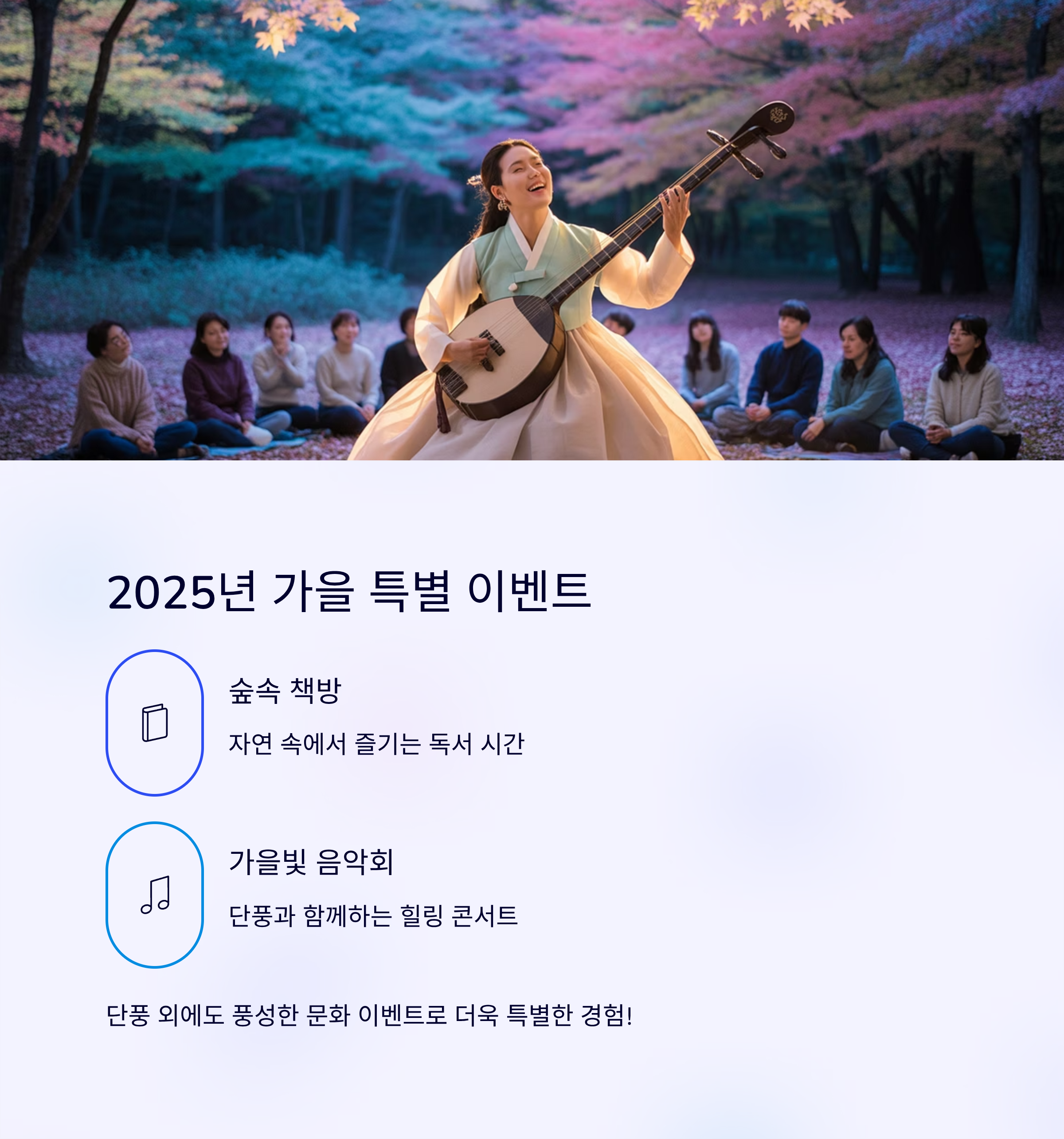 2025년 가을 시즌에는 "숲속 책방", "가을빛 음악회" 같은 문화 이벤트도 예정되어 있어 더욱 풍성한 경험이 될 것으로 기대돼요.