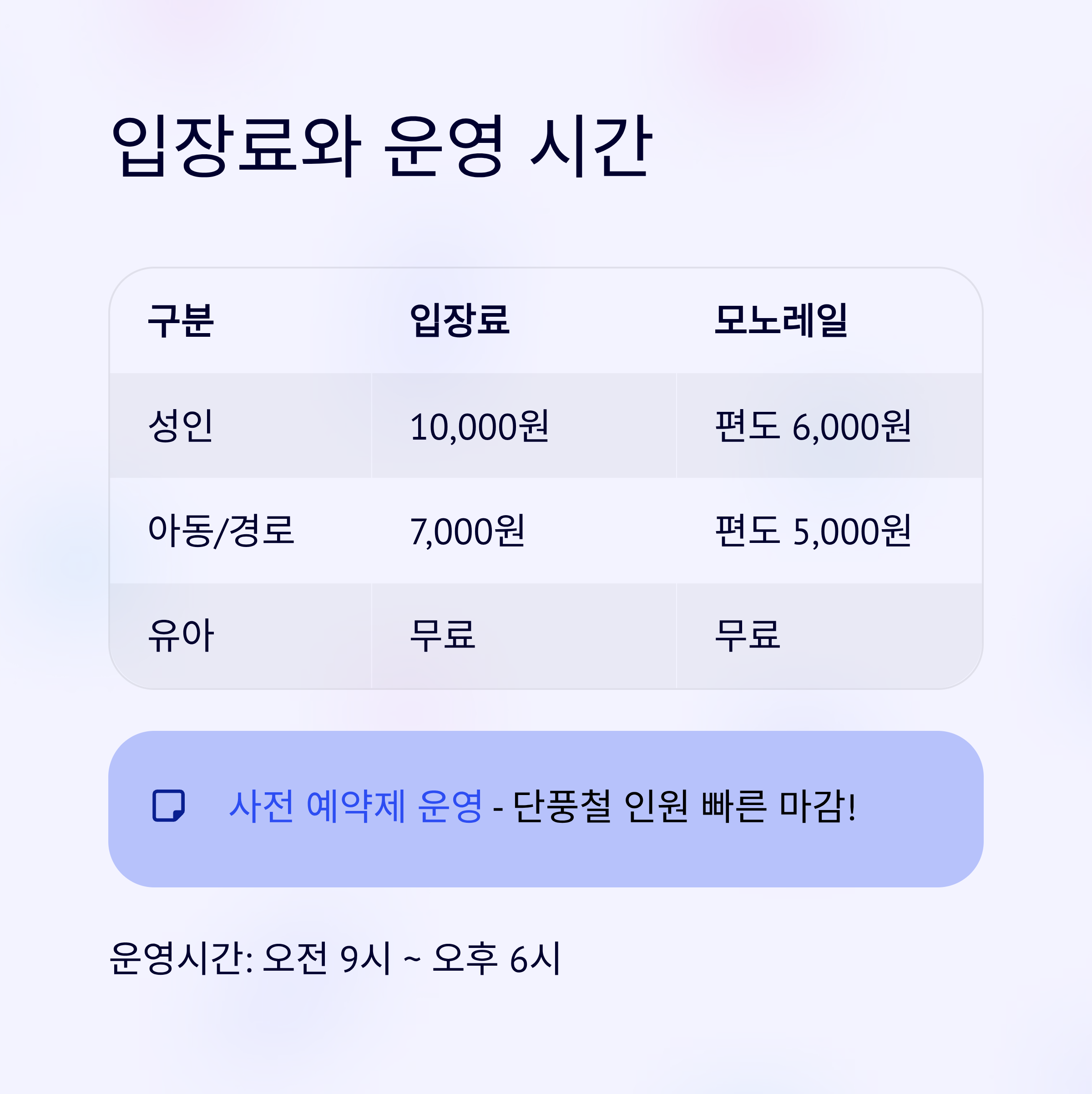 운영 시간은 오전 9시부터 오후 6시까지이며, 단풍 절정기에는 입장 마감 시간이 조기 조정될 수 있으니 사전 체크가 필요해요.