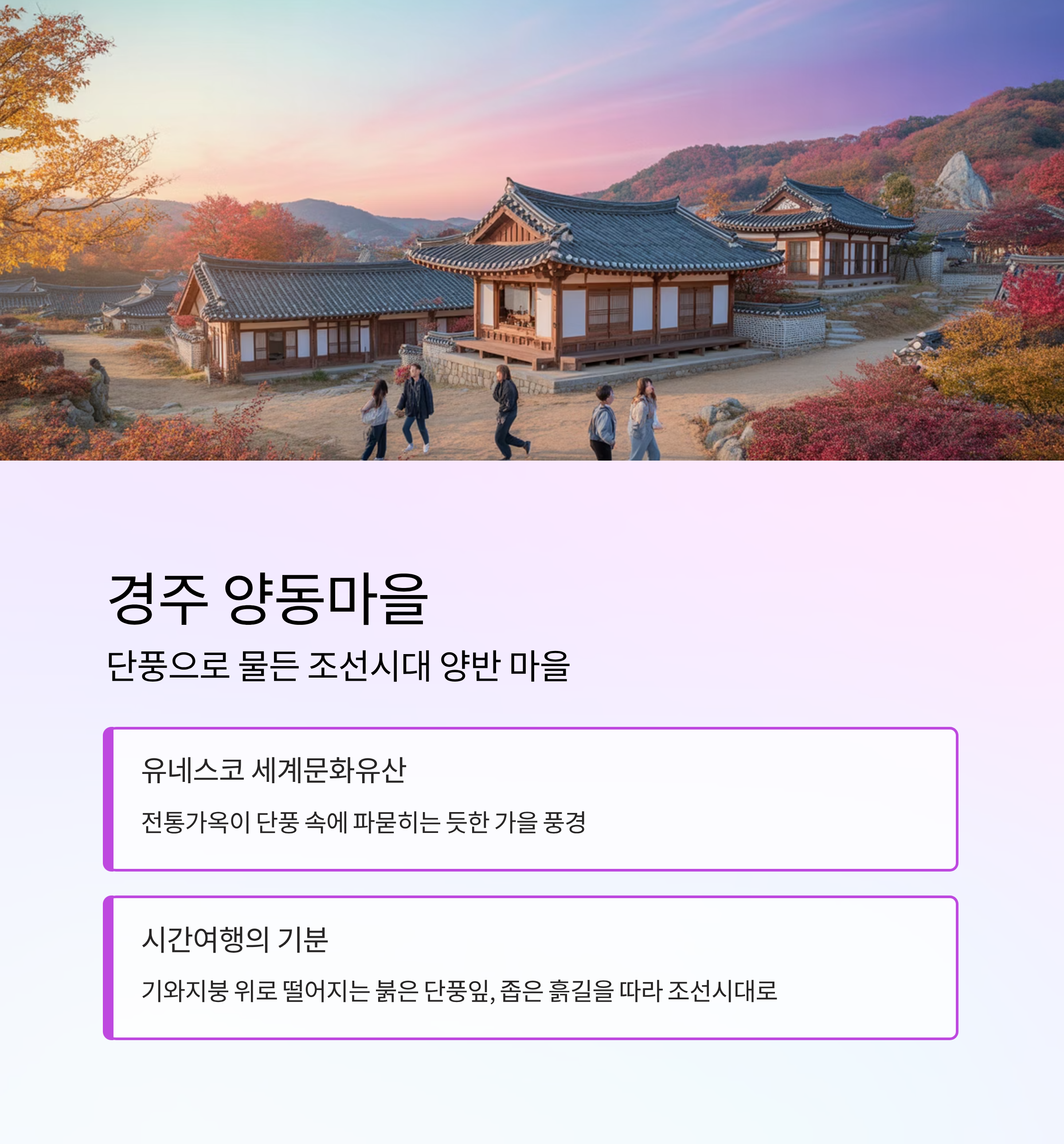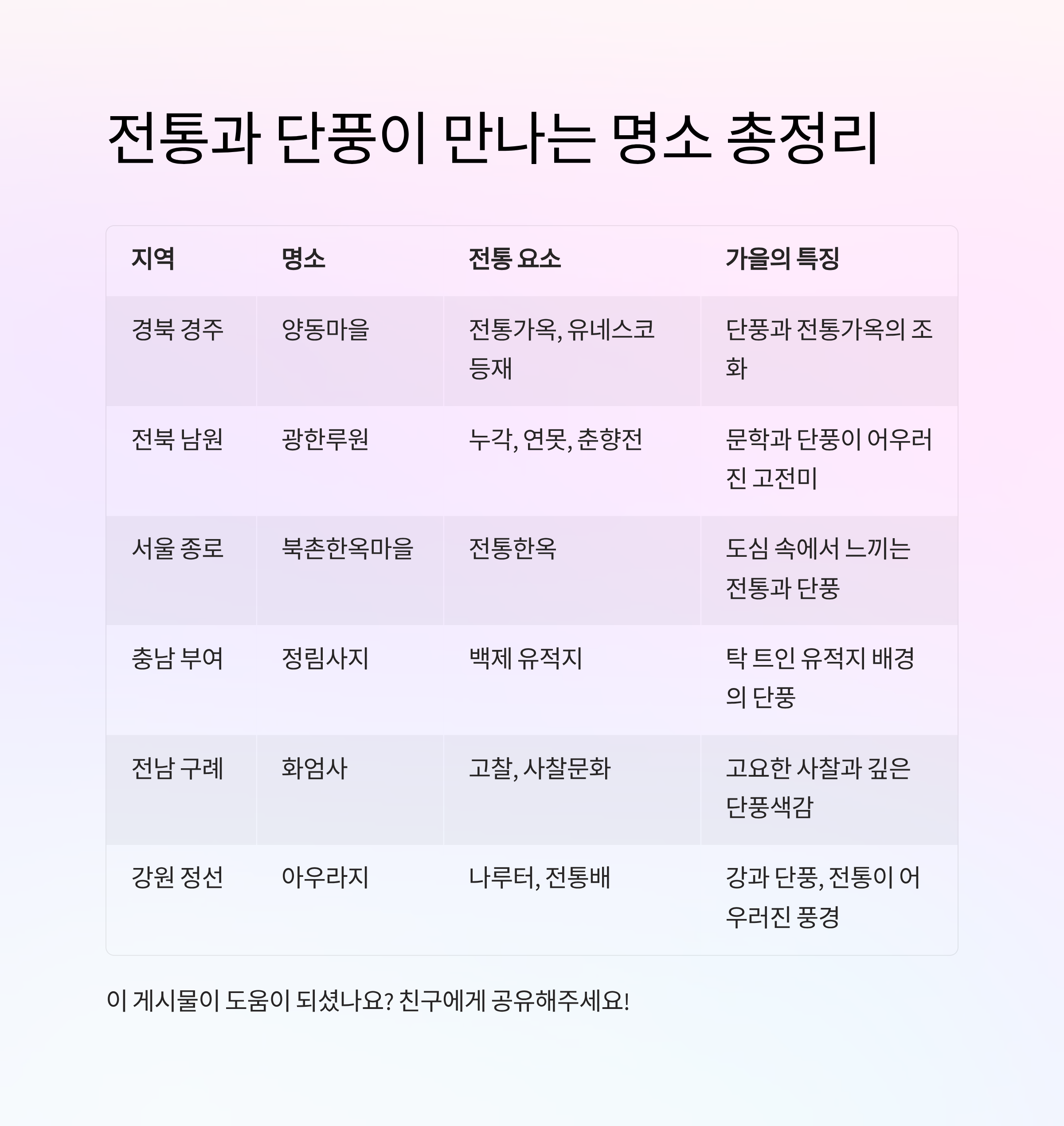 | 경북 경주 | 양동마을 | 전통가옥, 유네스코 등재 | 단풍과 전통가옥의 조화 |