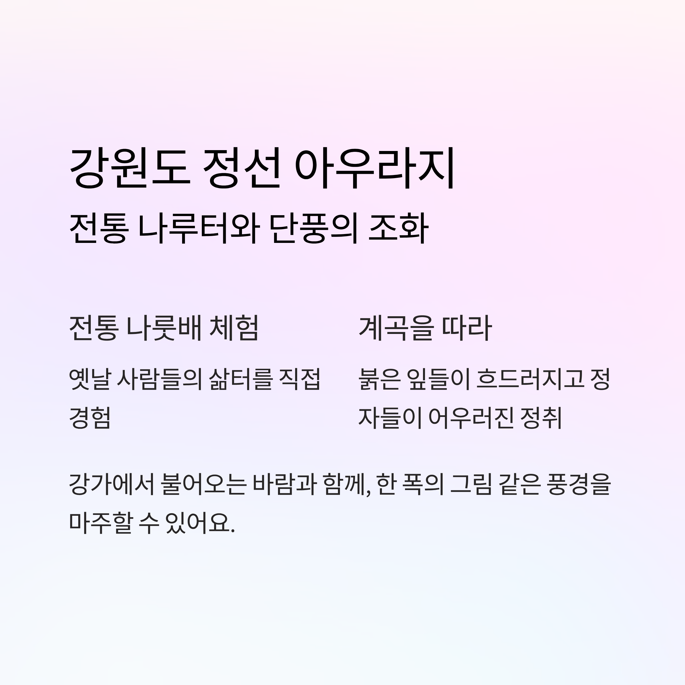 | 강원 정선 | 아우라지 | 나루터, 전통배 | 강과 단풍, 전통이 어우러진 풍경 |