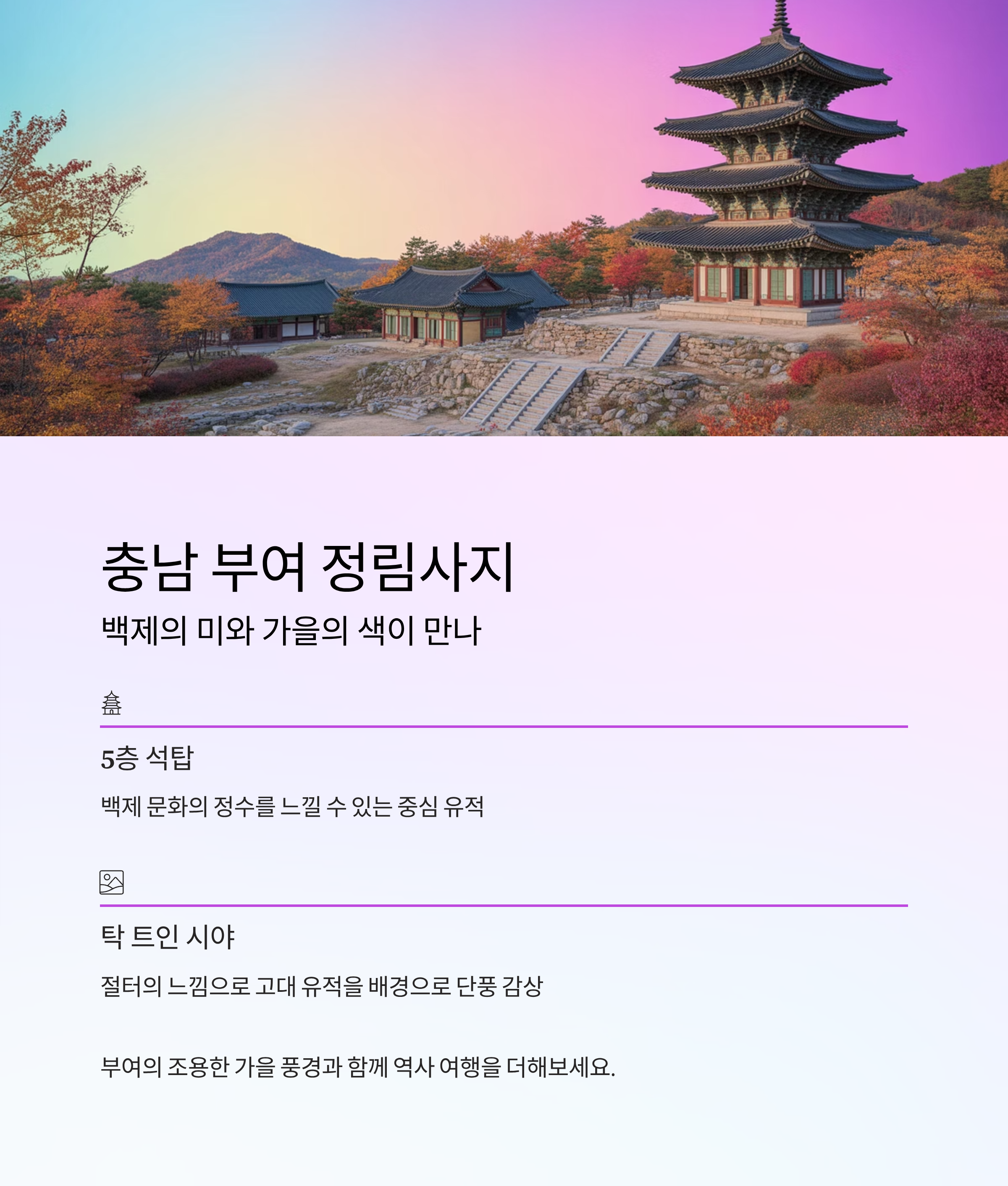 정림사지는 백제 문화의 정수를 느낄 수 있는 곳으로, 5층 석탑을 중심으로 단풍이 붉게 퍼지는 풍경이 인상적입니다.