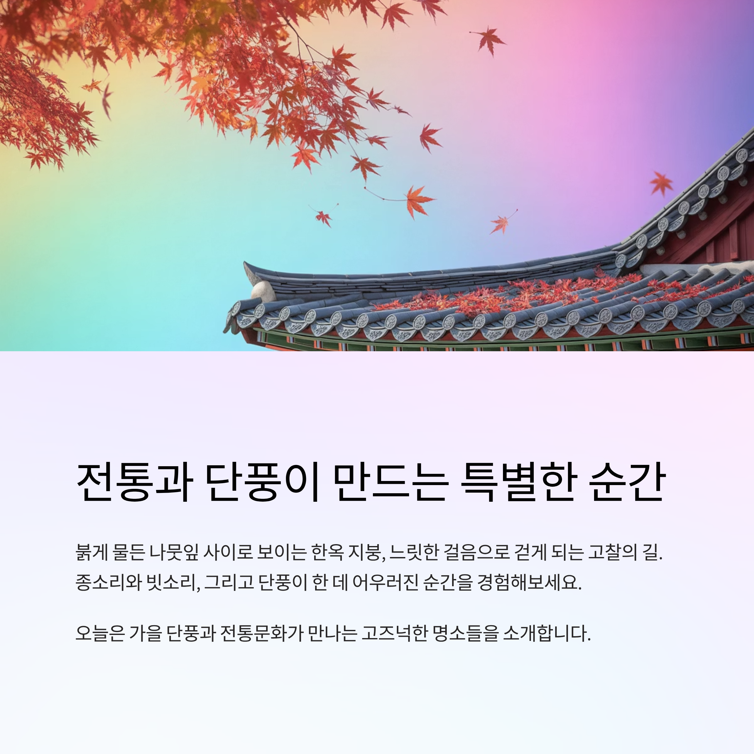 가을 단풍의 화려함도 좋지만, 전통문화와 어우러졌을 때 그 분위기는 훨씬 더 깊어집니다. 붉게 물든 나뭇잎 사이로 보이는 한옥 지붕, 느릿한 걸음으로 걷게 되는 고찰의 길, 종소리와 빗소리, 그리고 단풍이 한 데 어우러진 순간. 오늘은 가을 단풍과 전통문화가 만나는 고즈넉한 명소들을 소개해드릴게요. 단풍 그 이상의 가치를 경험할 수 있는 여행이 될 거예요.