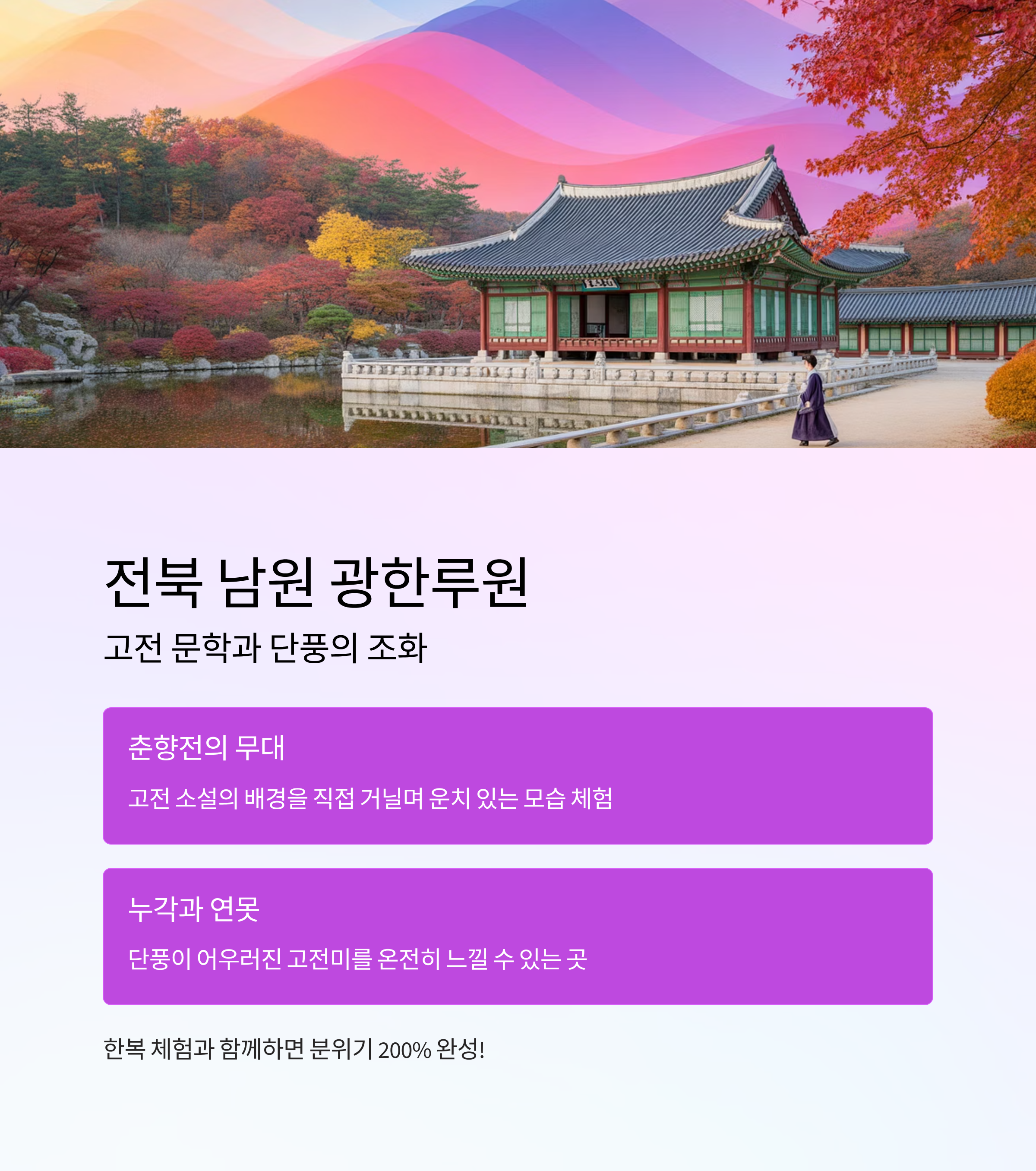 | 전북 남원 | 광한루원 | 누각, 연못, 춘향전 | 문학과 단풍이 어우러진 고전미 |