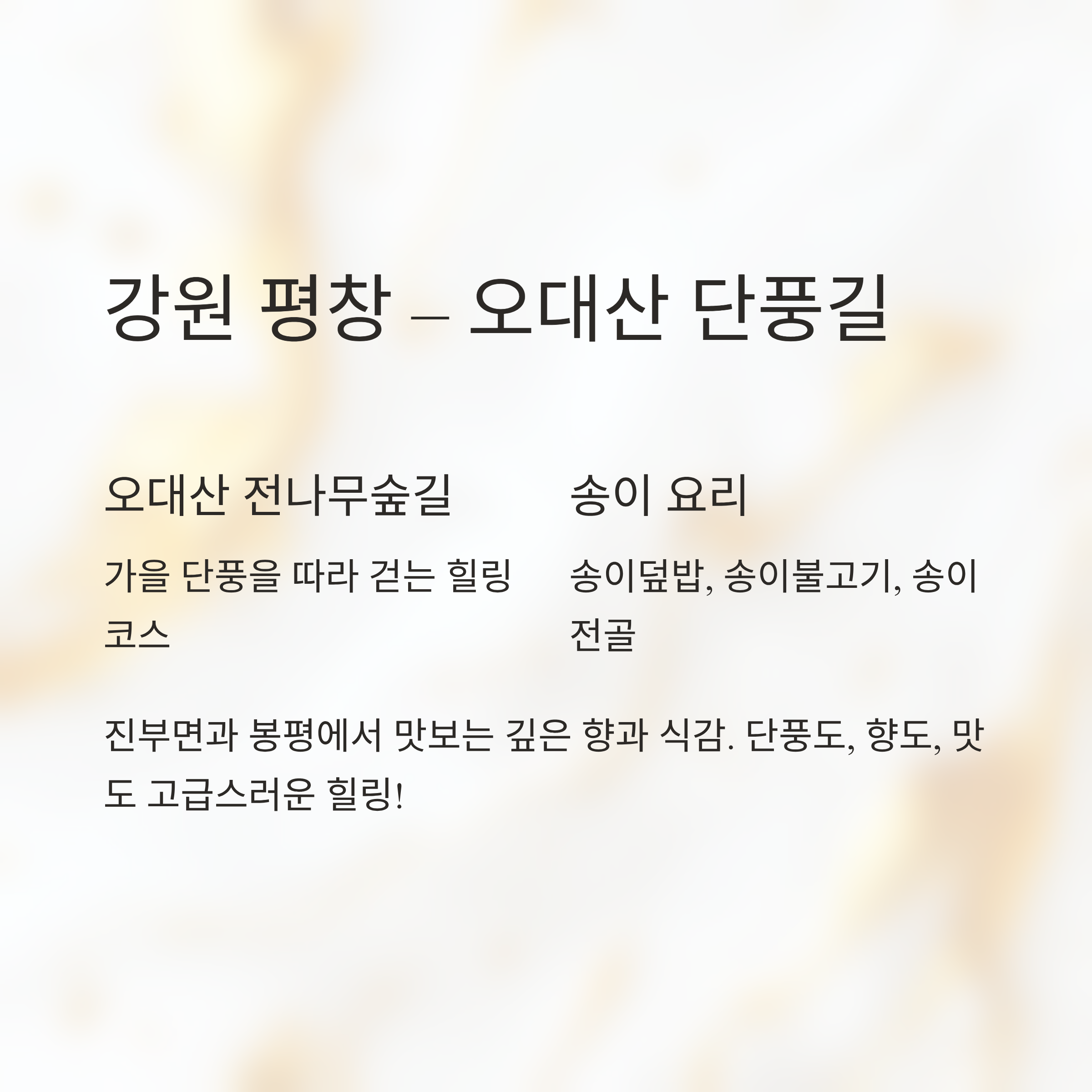 오대산 전나무숲길을 따라 가을 단풍을 즐긴 후, 인근 진부면이나 봉평에서 제철 송이요리를 꼭 맛보세요.